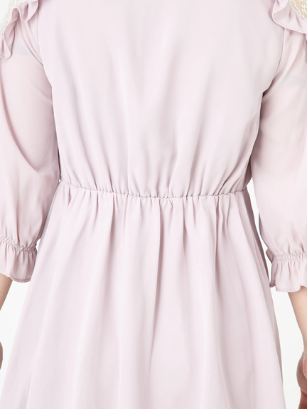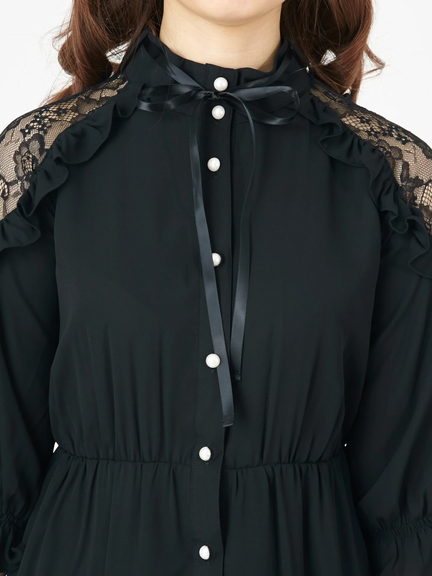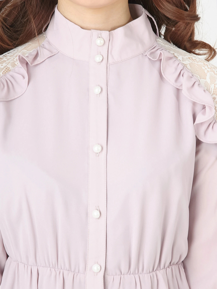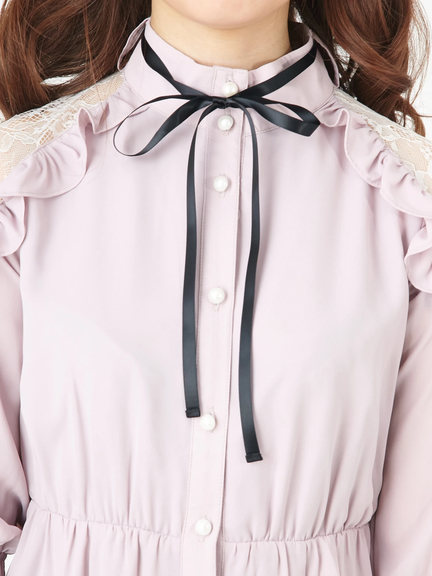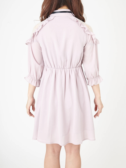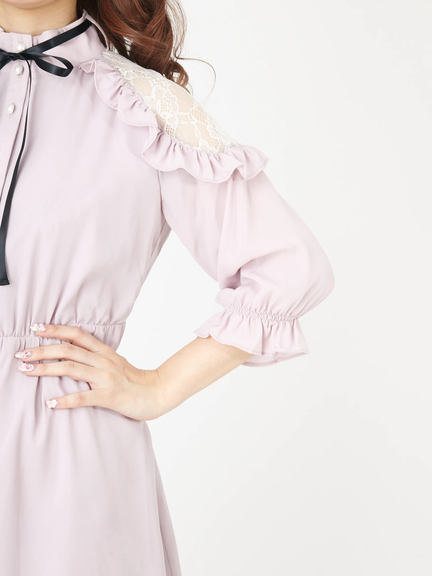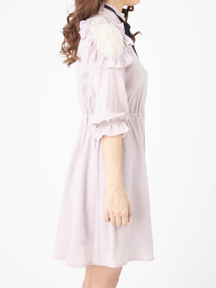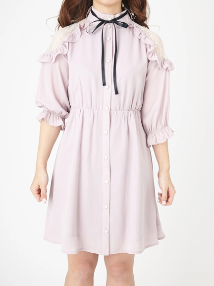 ショルダー部分が透けて、ガーリームードの高まるワンピースのお目見えです♪ レースがほどこされた肩部分は、フリルもほどこされて、甘さがたっぷり。プチハイネックには、リボンも付属して、可愛らしさが加速します。ハイウエスト切り替えで、裾に向かってほどよく広がるシルエットは、レッグラインをきれいに演出してくれます☆
