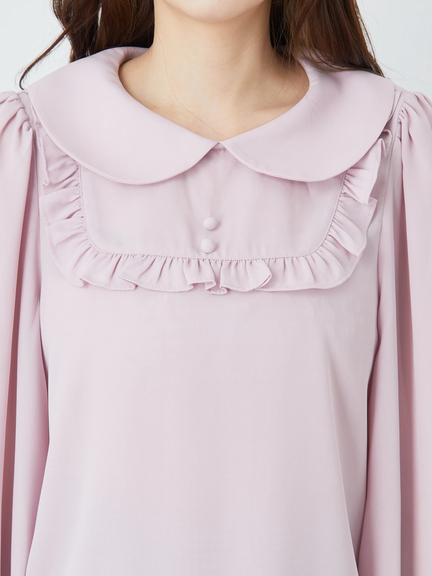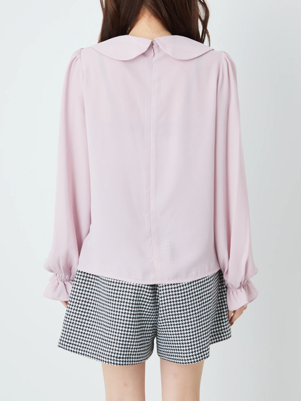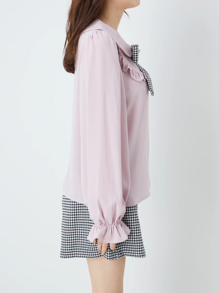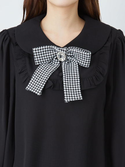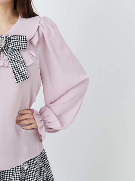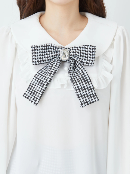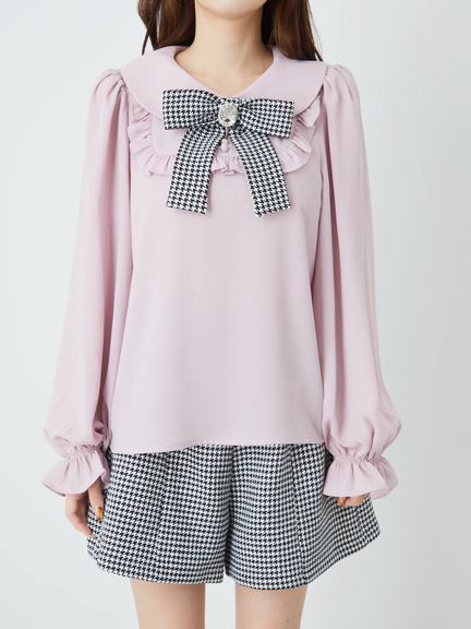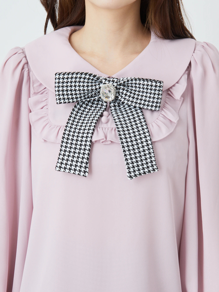 千鳥リボンが可愛いアクセントになって、ワンランク上のガーリースタイルを叶えるブラウスの登場です♪ ほどよくゆとりのあるシルエットは、女の子らしい華奢見せを叶えて、ボトムスにINもOUTもスタイルよくキマります。スリーブは、袖口に向かってボリュームを持たせることで、キュートな手元をアピール◎ 丸襟には、ヨーク切り替えがプラスされ、お顔まわりを華やかにアップデートしてくれます☆