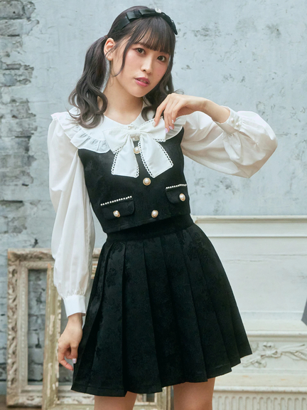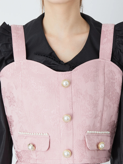 ジャガード生地で、クラスアップな雰囲気を醸し出すビスチェの登場です♪ 全面に、ジャガード織りの模様がほどこされ、クラシカルな印象を与えて、着こなしをアップデートします。パール調のボタンも付属して、可愛らしく、好アクセントに◎ 着丈が短く、バランスアップも叶えて、セットのスカートと合わせれば、スタイリッシュさがUPします☆