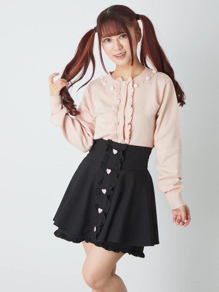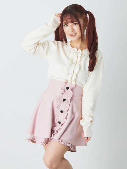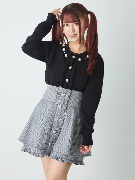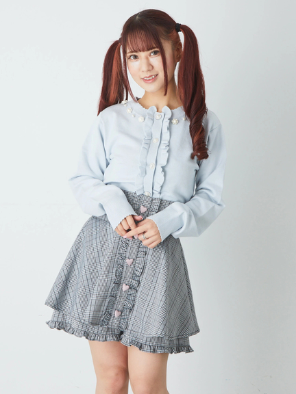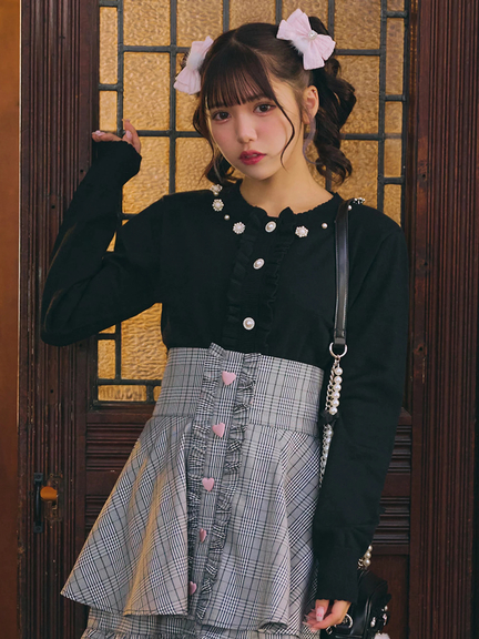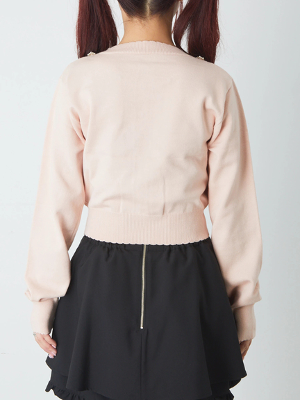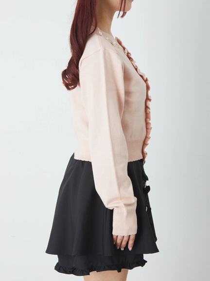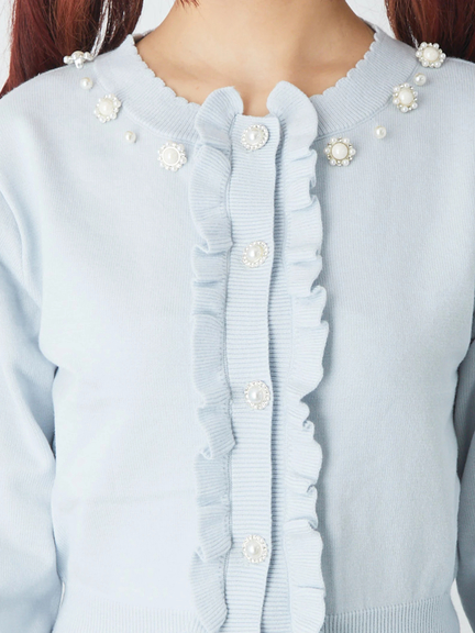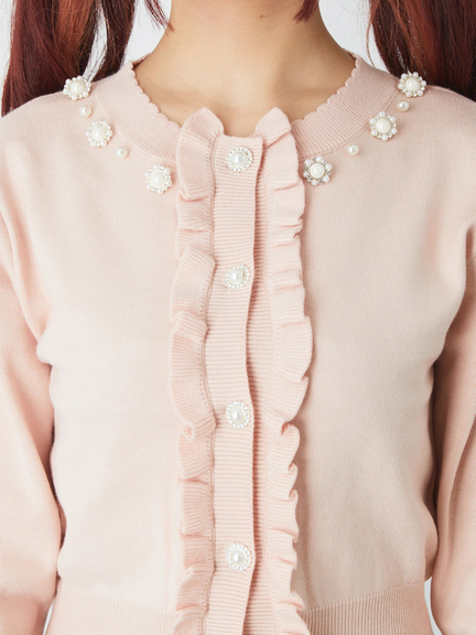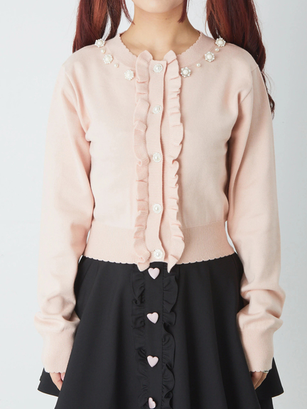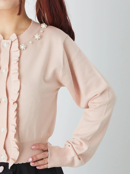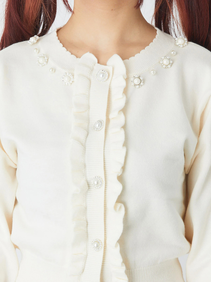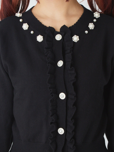 ビジューが付いて、ガーリームードを盛り上げるコンパクトカーデの登場です♪ パール&ビジューのモチーフが、あしらわれて、きらびやかさが増し、華やかな演出をしてくれます。ボタンのまわりには、フリルのデザインが、ほどこされて、甘いニュアンスをプラス◎ 着丈は短くコンパクトで、全体のスタイルアップが叶い、スリーブは長めの設計で、鮮度バツグンです☆