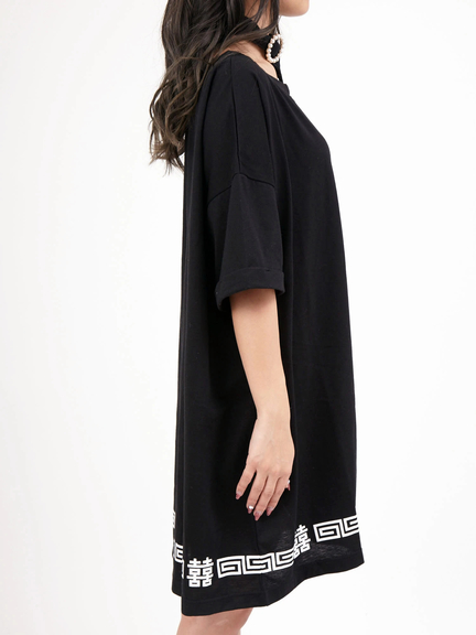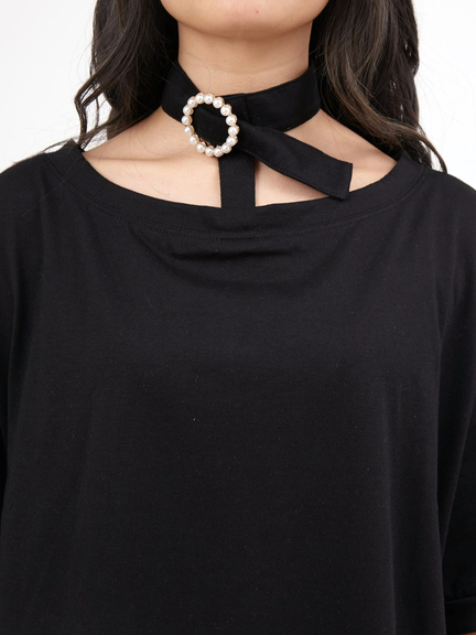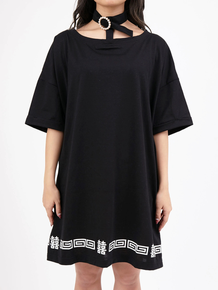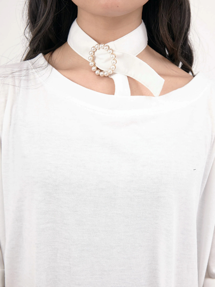 ルーズなシルエットに、甘めのチョーカーがこなれ感をプラスするTシャツの登場です! メンズライクなボリュームのあるTシャツは、一枚でワンピのように着こなすことで、ガーリー感がアップ! 裾にあしらわれたチャイナロゴが、カジュアルキュートな印象を演出します。太めのチョーカーは、首まわりを華奢に見せてくれ、パールのチャームが存在感バツグンのアイテムです!
