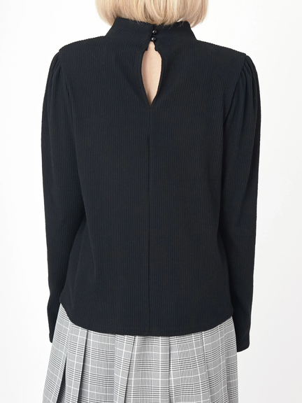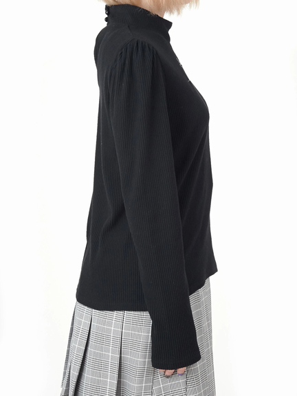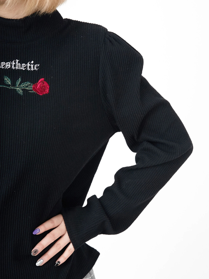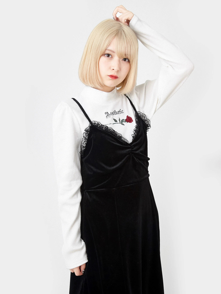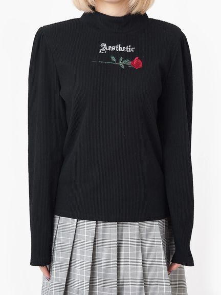 ローズの刺しゅうが入り、ガーリームードにあふれるテレコTOPSの登場です♪ 胸元には、バラの刺しゅうがほどこされて、好アクセントの映えるアイテム◎ 首まわりは、プチハイネックに、後ろにはティアドロップホルダーが付いて、女の子らしさも加速します。スリーブは長めの設計で、ほどよい身頃と丈感になり、旬なスタイリングが楽しめる一着☆