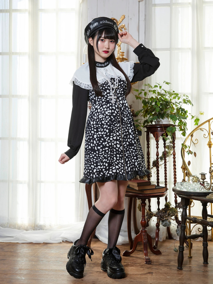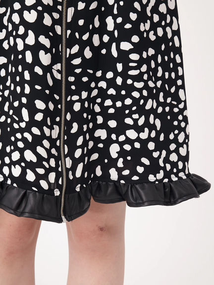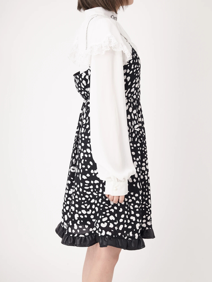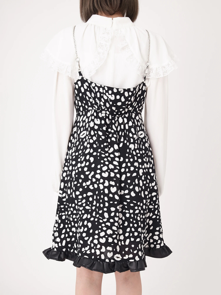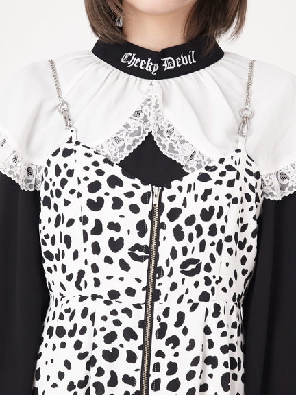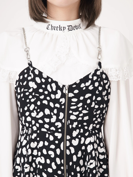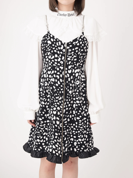 ダルメシアンプリントで、旬なガーリースタイルを楽しめるキャミワンピの登場です♪ 全面にほどこされたダルメシアン柄が、スタイリングの好アクセントになります。肩ヒモは、チェーン仕様で、フロントはジップになり、辛口なディティールも充実して◎ 裾はフリルデザインになり、可愛らしさもプラスできて、鮮度抜群な一着です☆