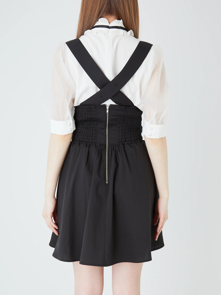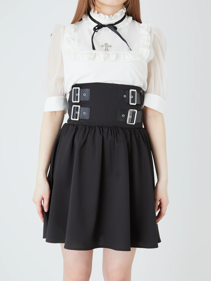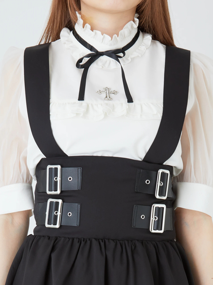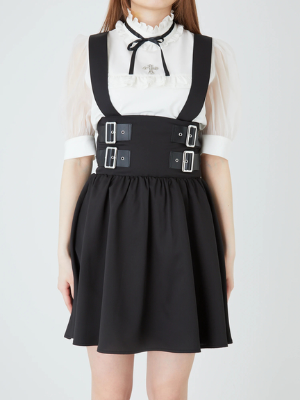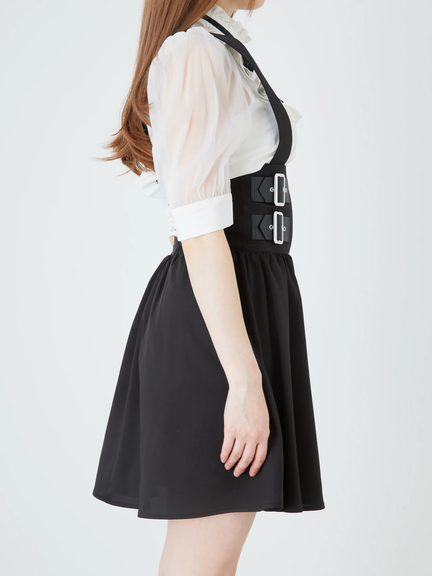 ハイウエストデザインで、ゴシックムードを漂わせるジャンパースカートのお見え見えです☆ 腰の位置が高い設計で、バックル風のあしらいが、スパイシーに映えます。裾に向かって、ふんわりと広がるミニシルエットが、可愛らしく、レッグラインをキレイに魅せてくれて◎ 肩ヒモは取り外しができるので、表情の変化も楽しめる逸品です♪