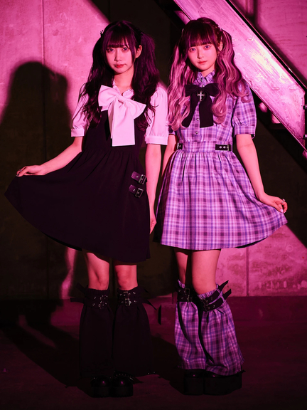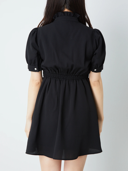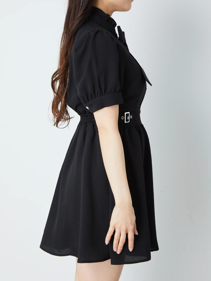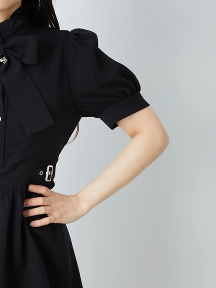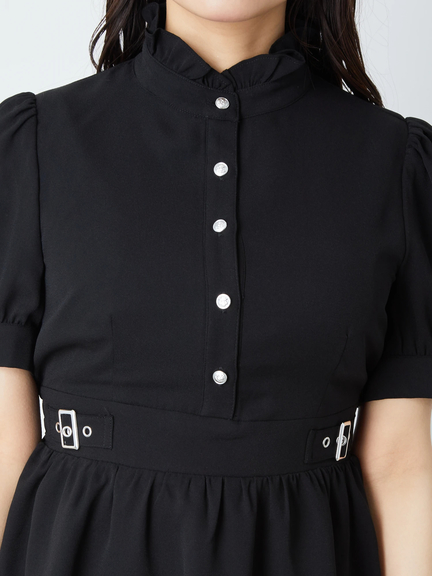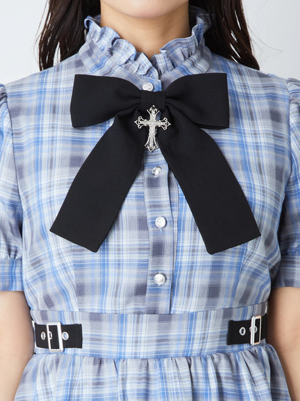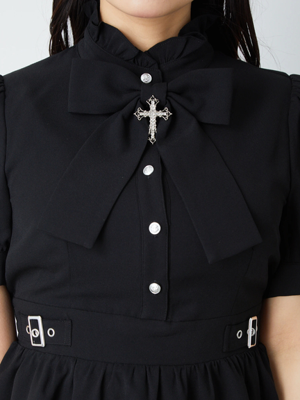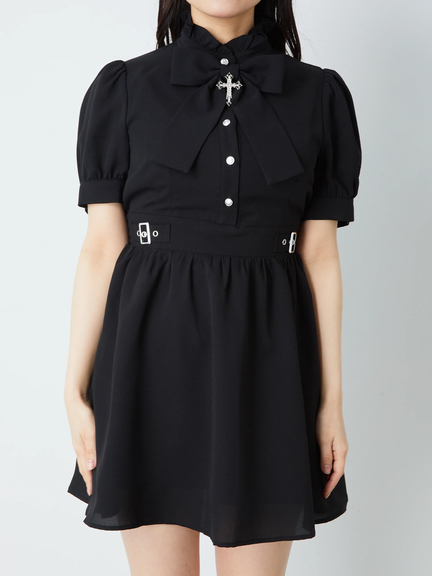 キラリと輝くクロスモチーフがポイントになって、ゴシックな魅力を高めるワンピースの登場です♪ フリルをONしたスタンドネックに、リボン&クロスモチーフがついて、お顔まわりを可愛くアップデート◎ ハイウエストな位置でシェイプされ、ふんわりと広がるスカートラインで、女の子らしいメリハリのあるルックスをアピールできます☆