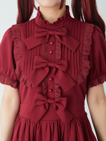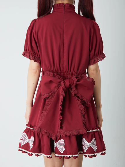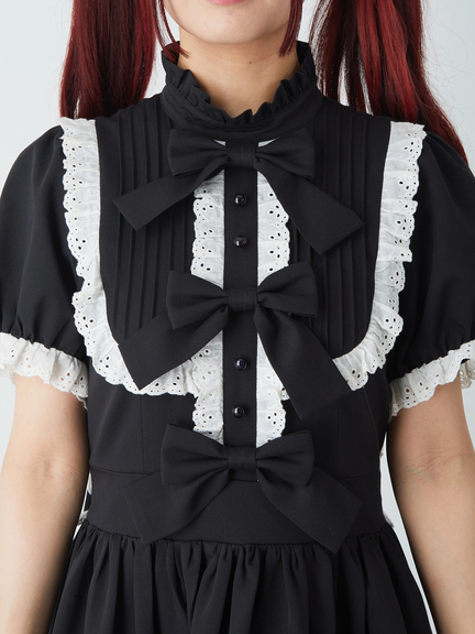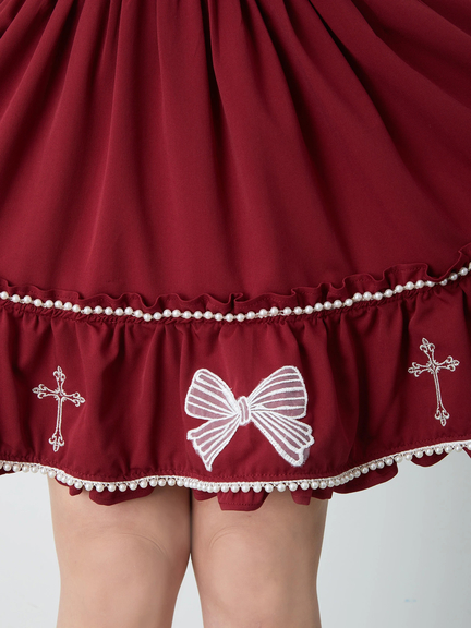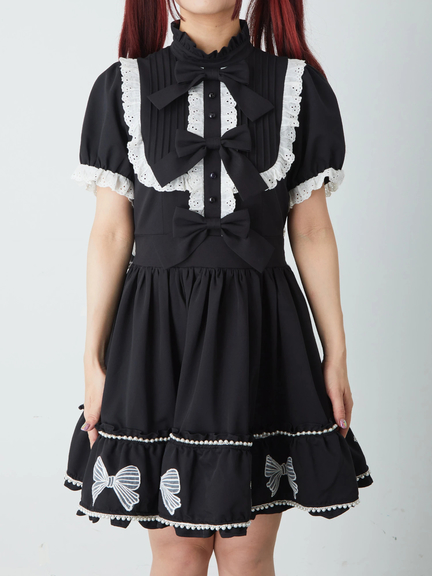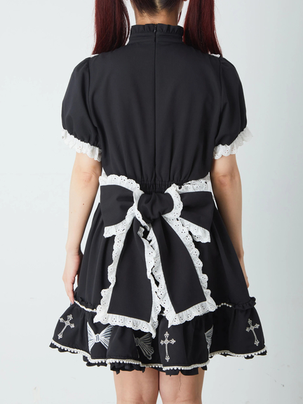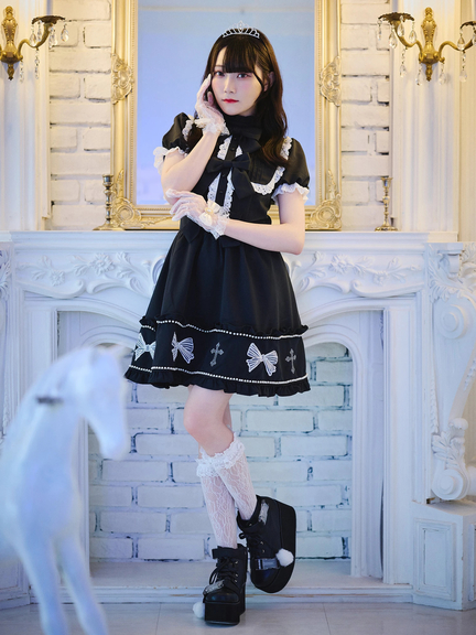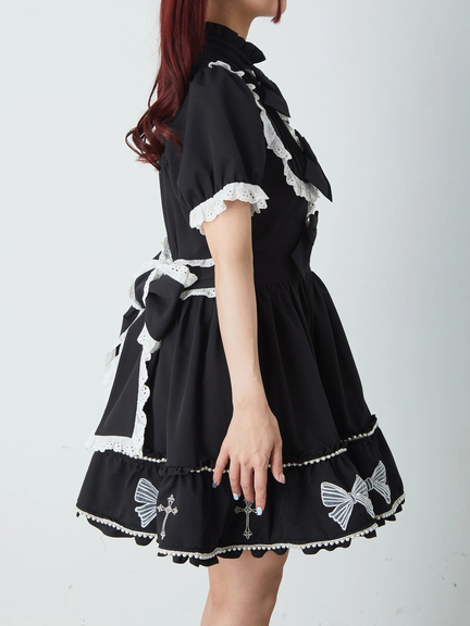 リボンデザインで、ガーリーニュアンスが加速するゴシックワンピースのお目見えです♪ フロントとバックに、リボンが、ほどこされて、可愛らしく、スタイリングの好アクセントとして、着映えします。裾には、クロスとリボンのプリントが、あしらわれて、甘辛テイストをON◎ フリルをふんだんに使い、甘さがあふれます。ハイウエストなシルエットに、ボリュームのメリハリがあり、旬なゴシックガールを演出してくれます★
