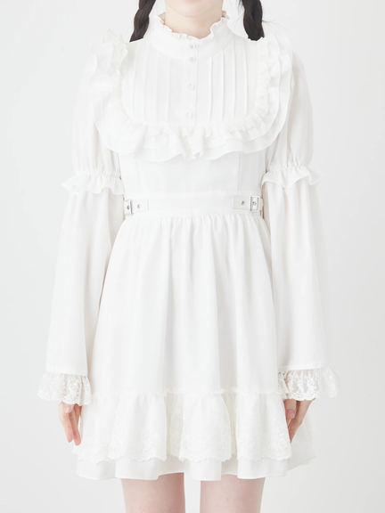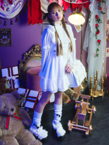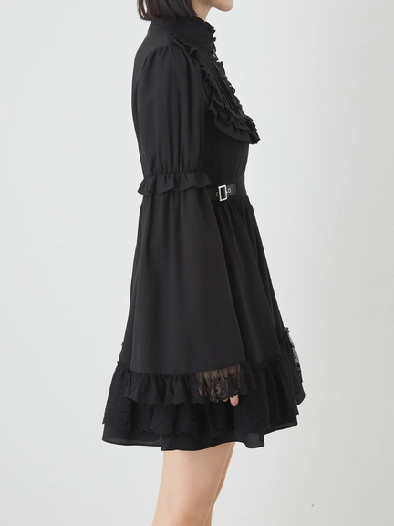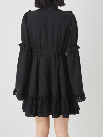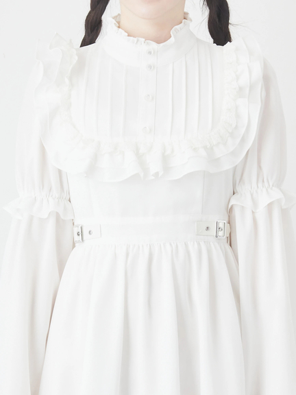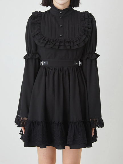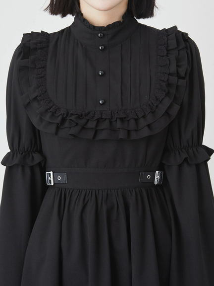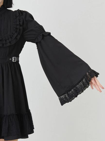 ゴシック可愛い雰囲気を醸し出すドーリーワンピースのお目見えです♪ 袖口が広がるスリーブデザインで、可愛らしく、着こなしをアップデートしてくれます。スタンドカラーに、タック入りのヨークが、クラスアップな印象をUP◎ ハイウエスト位置には、ベルトがONされて、スパイシーさを与え、旬なゴシックスタイルを演出してくれます★