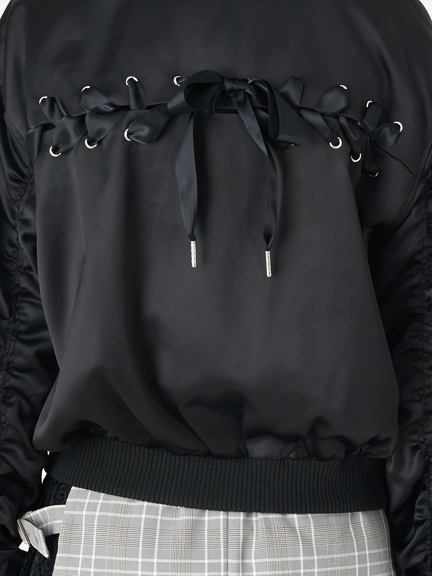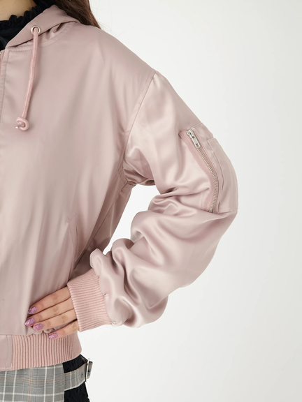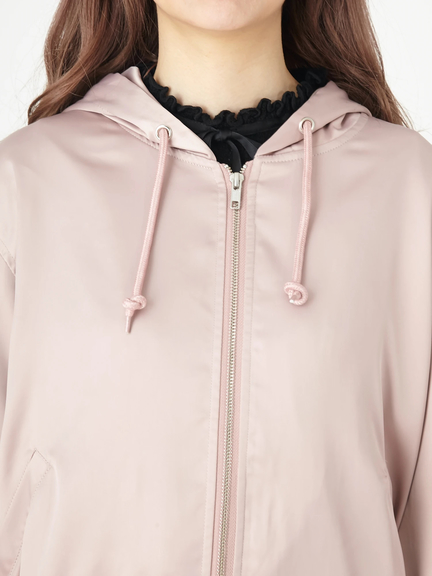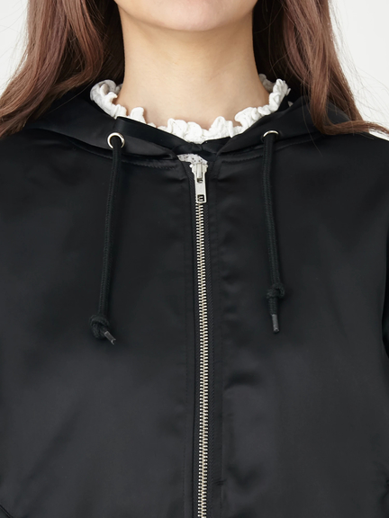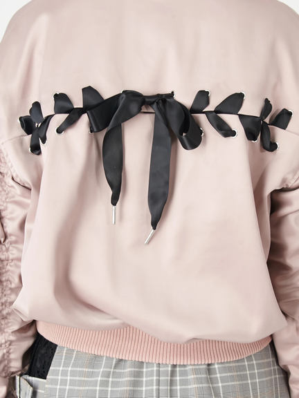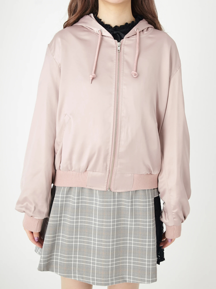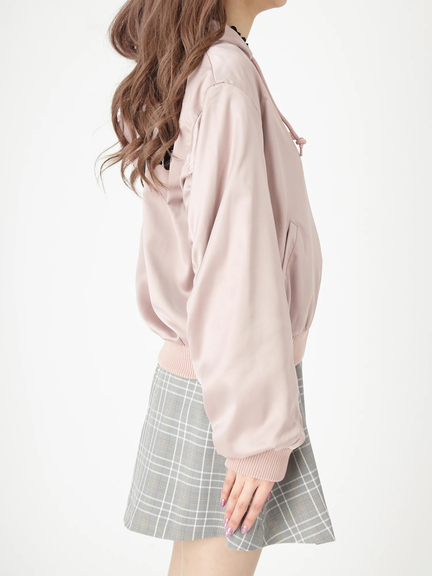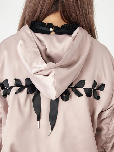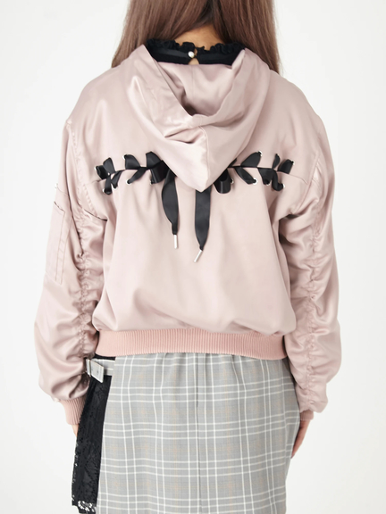 背中のスピンドルリボンが、ガーリーなアクセントをプラスするブルゾンがお目見えです♪ コンパクトな着丈に、ゆるっとしたシルエットが可愛く、華奢見せ効果バツグンの一枚◎ ふんわりとボリュームのあるスリーブは、甘いニュアンスをアピールします。フード付きで、フロントを開けても閉めても、スタイルよく決まる逸品です☆