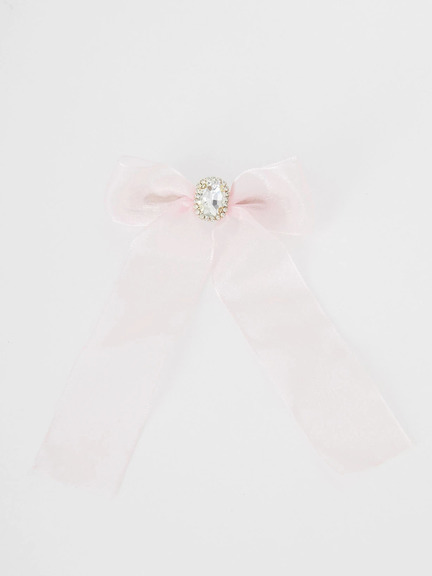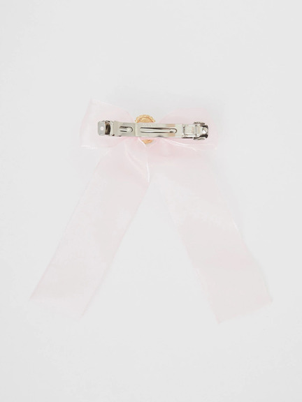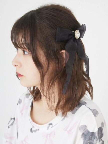オーガンジーの透け感で、ガーリームードが盛り上がるリボンバレッタの登場です♪ 大きめのリボンに、ビジューが付いて、甘くてきらびやかな印象へと導いてくれます。透けた素材感も、可愛さをアップさせて、ヘアスタイルだけでなく、スタイリング全体のアクセントとしても活躍する逸品です☆