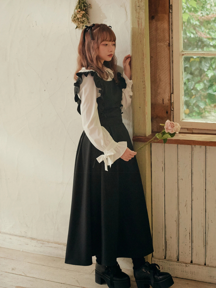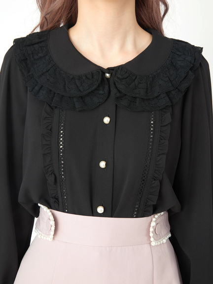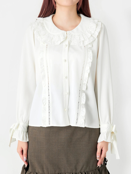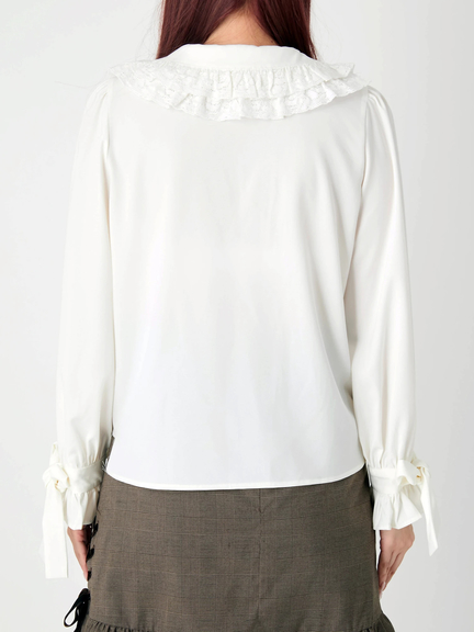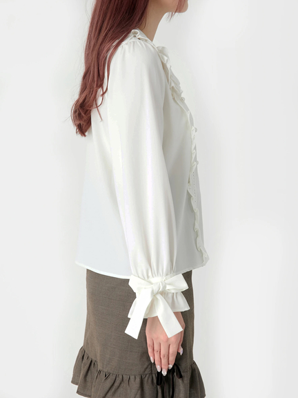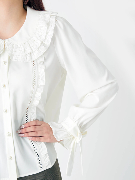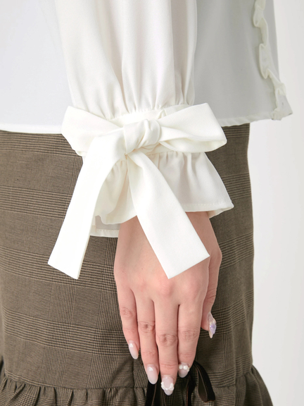 リボンカフスが付いて、旬なガーリースタイルを満喫できるドーリーブラウスのお目見えです♪ デコルテまわりは、ヨークにフリルレースがあしらわれて、可愛らしく、顔まわりを華やかに演出します。スリーブは長めの設計に、袖口には、リボンカフスがほどこされて、スイートさをプラス◎ 上品で清楚感があり、女の子らしさが高まるアイテムです☆