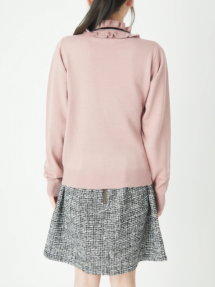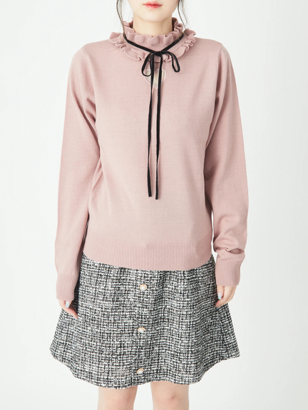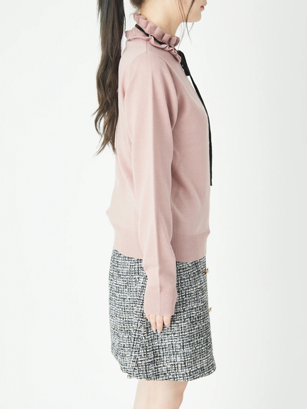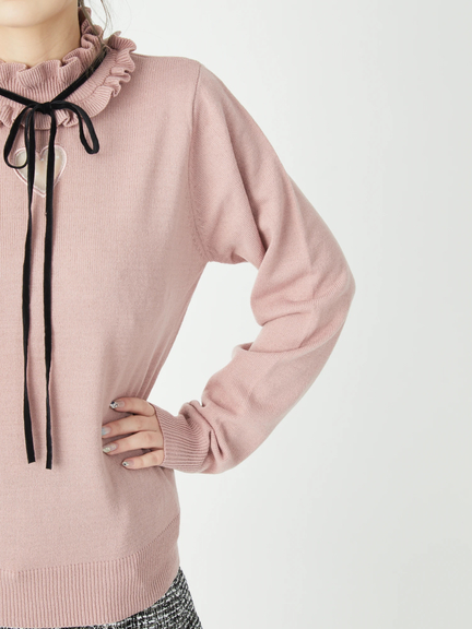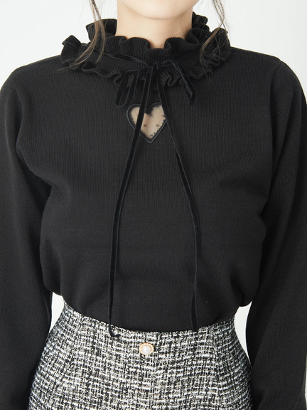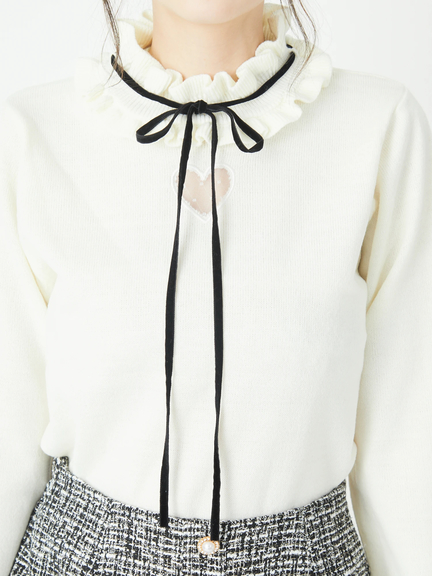 ハートの中からチラリと見える肌感が、大人のスウィートな雰囲気を高めるニットのお目見えです♪ 洗練されたシンプルなルックスに、首元のフリルが映えて、お顔まわりを可愛くアップデート◎ リボンは華奢感があり、スタイリングを品よくまとめてくれます。ボトムスにINもOUTも、すっきりとキマるオススメの逸品です☆