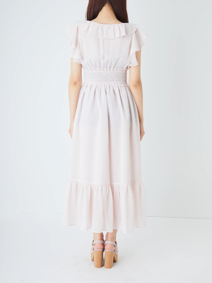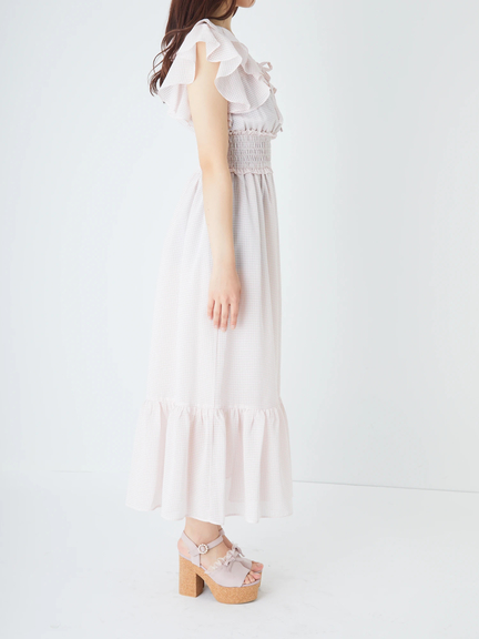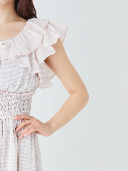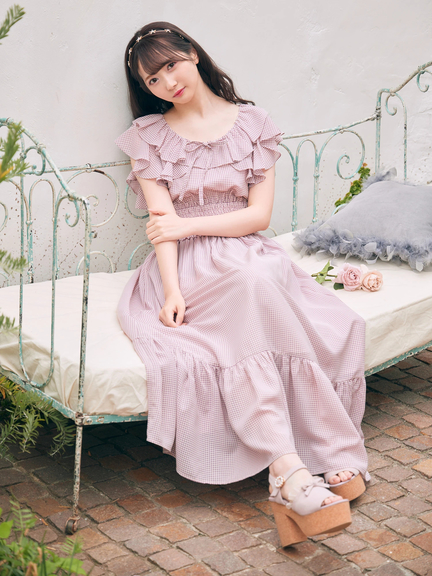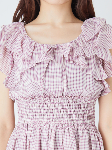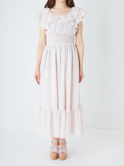 チェック柄がキュートなアクセントになって、ガーリー度がグッと高まるワンピースの登場です♪ 軽やかなシアー素材を使用し、ふんわりと揺れ動くシルエットが、シーズンらしい着こなしを後押しします。ハイウエストなラインに、シャーリングがONされ、ロング丈で、スタイルアップをメイク◎ お顔まわりのフリルが、可愛く映えて、甘いニュアンスをアピールしてくれます☆