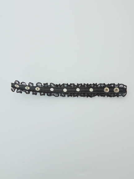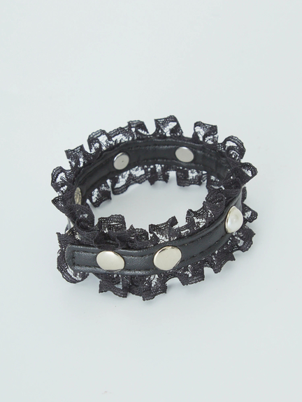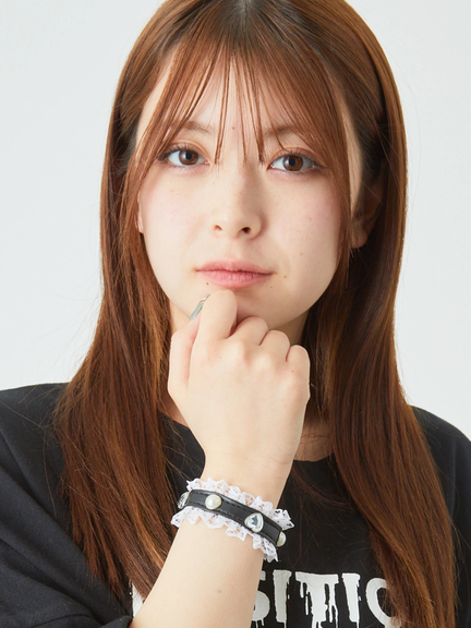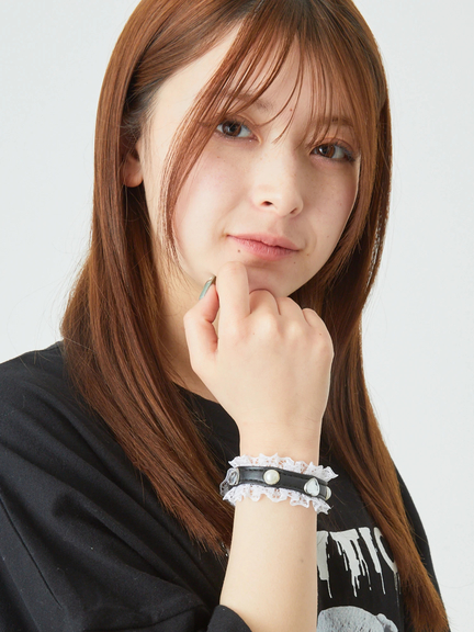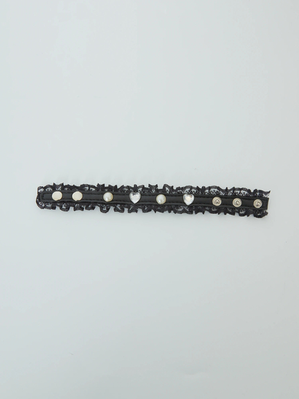 ハートビジューとパールが並んだシルエットで、愛らしさバツグンなルックスをメイクするブレスの登場です♪ 合皮ベルトに、レースフリルがONされ、甘辛MIXな雰囲気をアピール◎ コーデの仕上げにプラスするだけで、一気にガーリー度がUPします。ボタンで調整できるので、ジャストな位置でつけれるのも魅力☆