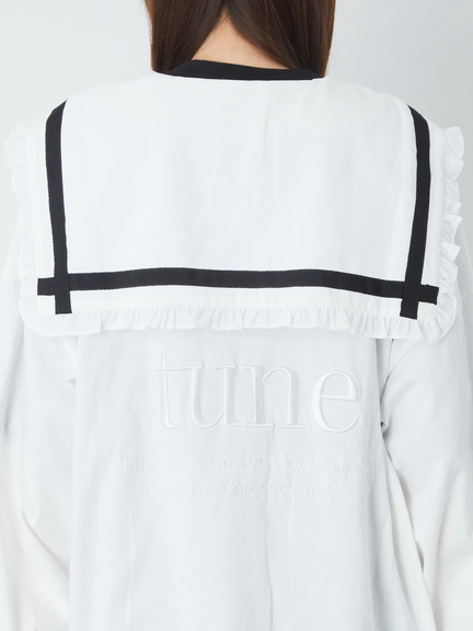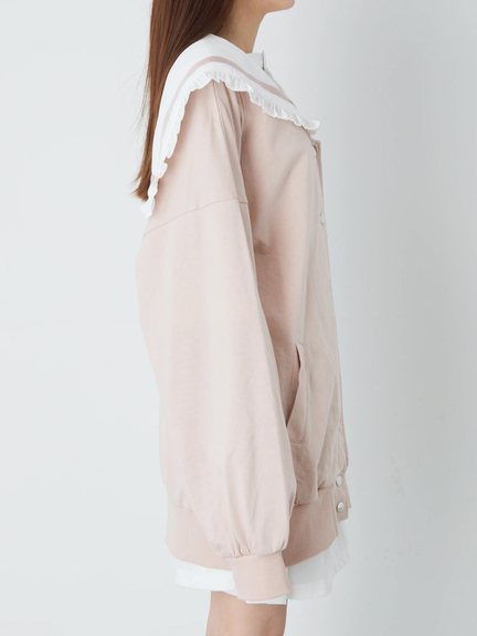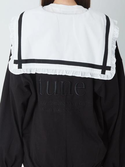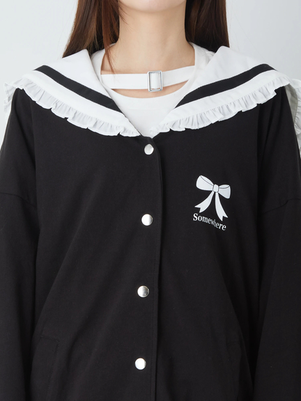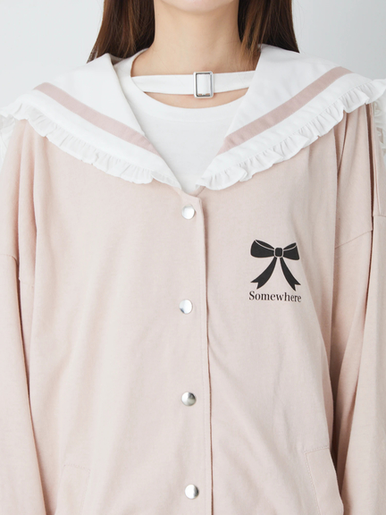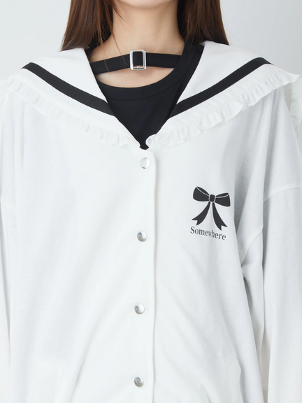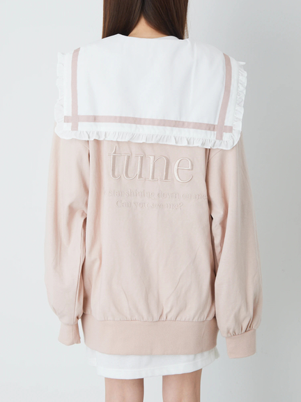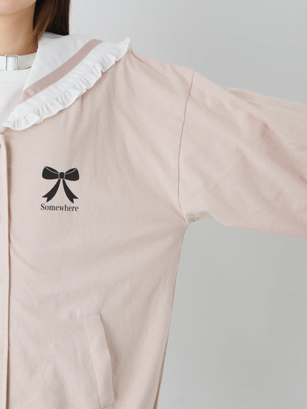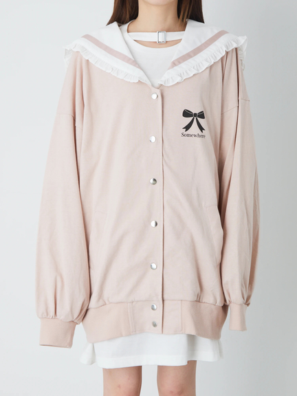 フリル&パイピングをONしたセーラーカラーが可愛いパーカーの登場です♪ ゆるっとしたロングシルエットで、女の子らしく、華奢見せ効果もバツグン◎ ボリュームのあるスリーブが、手元をすっぽりと包み、萌え袖をアピールします。胸元のリボンプリントもポイントになって、どこから見てもキュートにキマる逸品です☆
