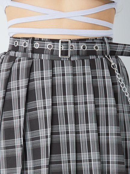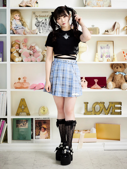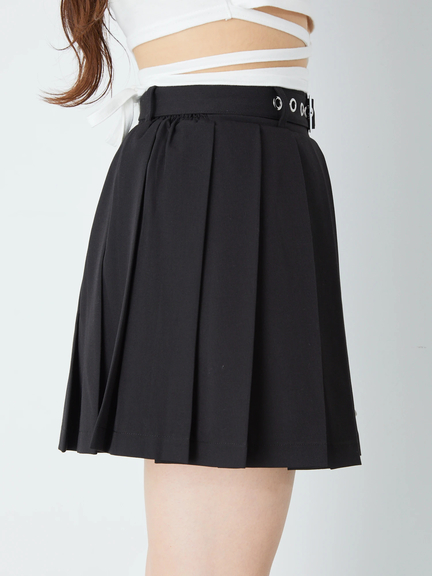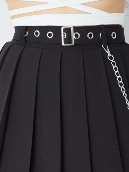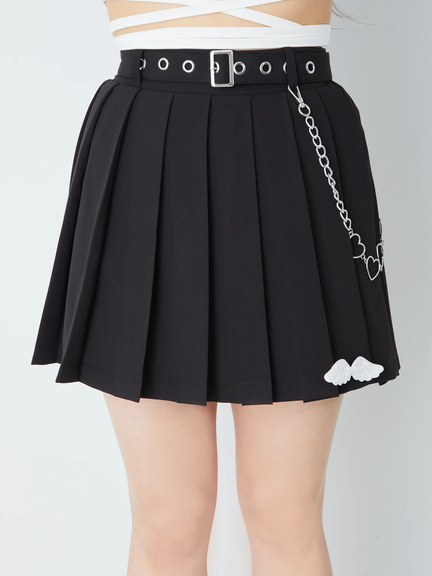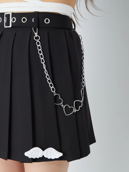 エンジェル&チェーンが付いて、ガーリームードが高まるプリーツスカートの登場です☆ サイドに連なるハート&チェーンがほどこされて、可愛らしく、スタイリングの好アクセントとして、視線を集めます。裾には、エンジェルモチーフが付属して、キュートさをUP◎ ハイウエスト設計で、ベルトが付き、腰まわりがシェイプされて、プリーツのラインが、美脚を演出してくれる逸品です☆