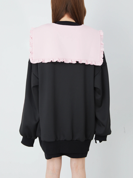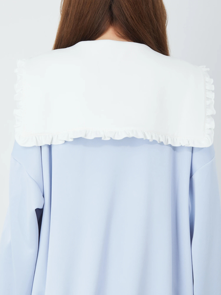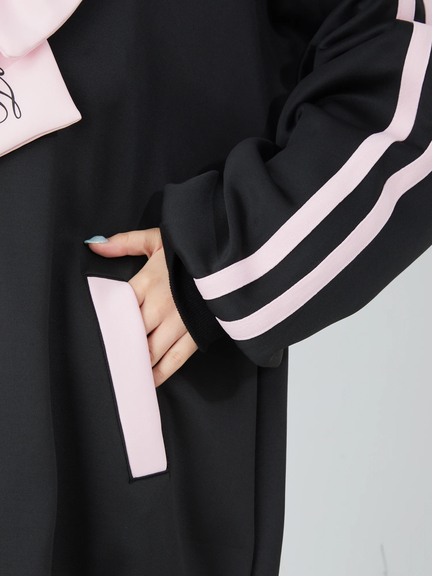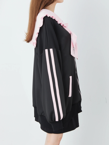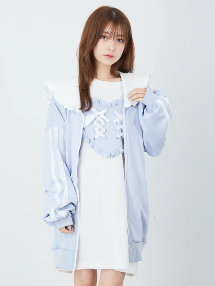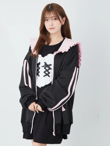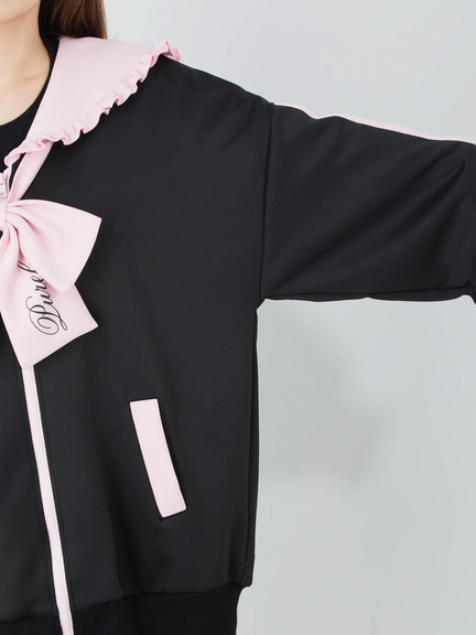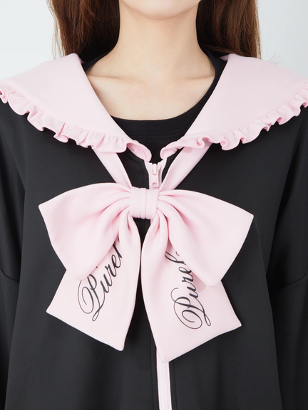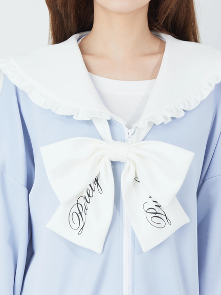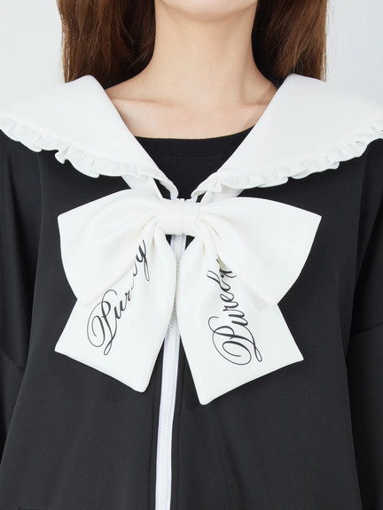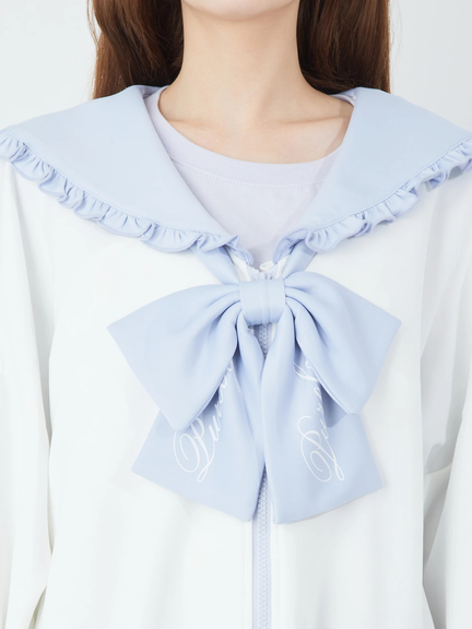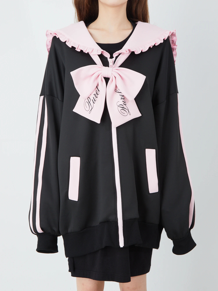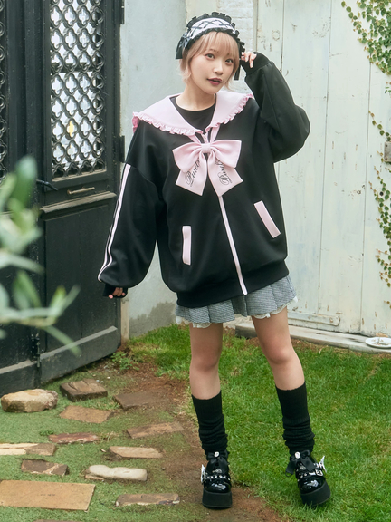 ジャージ素材で、ゴシック&ガーリーなムードを叶えるセーラーパーカーの登場です♪ 首元には、大きなロゴ入りリボンが、ほどこされて、可愛らしく、お顔まわりを華やかに、演出してくれます。ヨークも大きいデザインで、周りのフリルが甘さをプラス◎ スリーブが長い設計で、着丈も長くたっぷりとして、女の子らしさがUPします☆