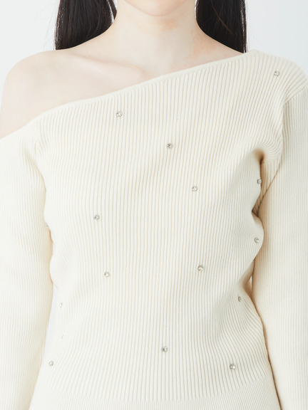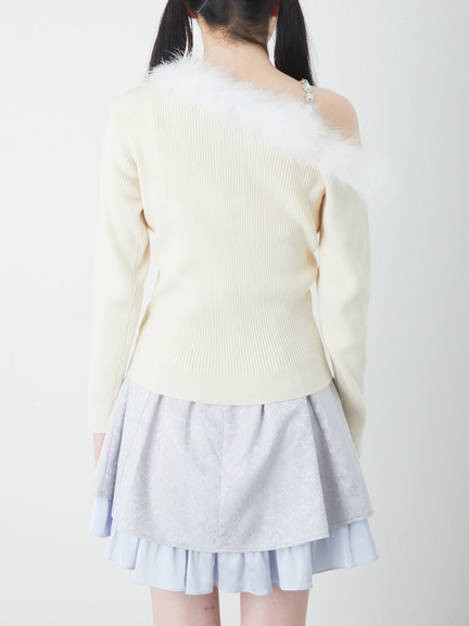 キラキラ&フェザーで、ガーリーニュアンスが加速するオフショルニットトップスのお目見えです♪ オフショルラインに、フェザーが、ほどこされて、ふんわりとして、お顔まわりを、華やかに演出します。肩ヒモが、ビジュー仕様で、きらびやかさも満点◎ 身頃は、ほどよくフィットし、スリーブは、長めの設計で、鮮度が高く着こなせます♪