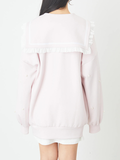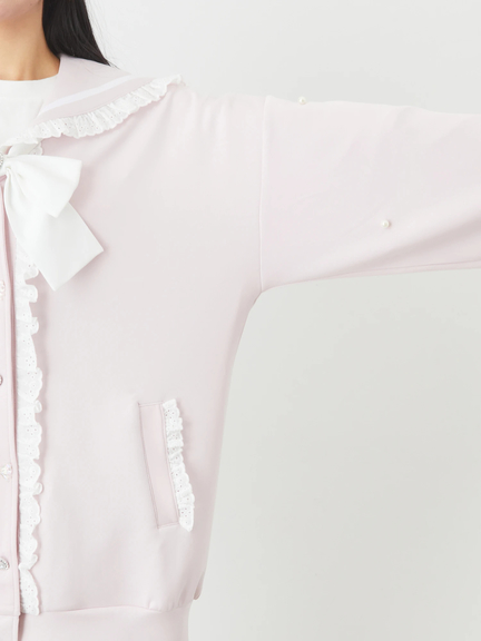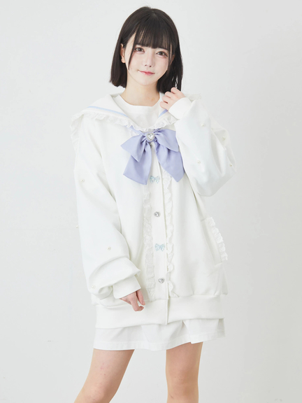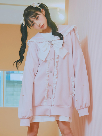 リボン&ハートパーツで、ガーリーニュアンスが加速するセーラーパーカーの登場です♪ 首元には、リボンとハートビジューが、デザインされて、華やかさがあり、お顔まわりを、明るく演出してくれます。ボタンは、ビジューとハートモチーフが、あしらわれて、可愛らしさがUP◎ 着丈が長めの設計で、スリーブともに、たっぷりとして、抜け感ある旬なスタイルが、楽しめる一着です☆