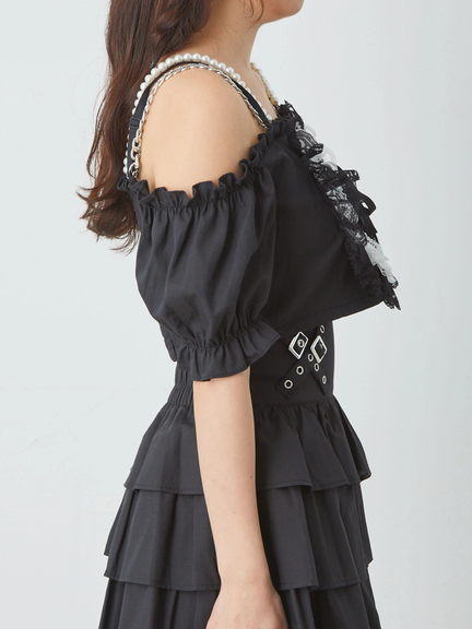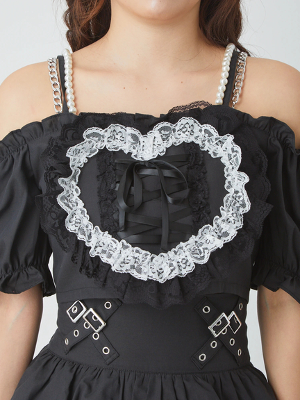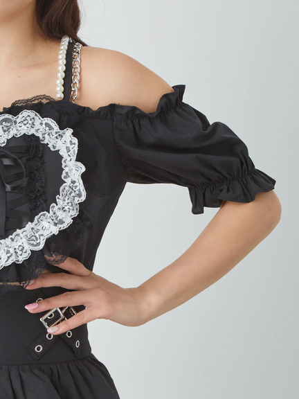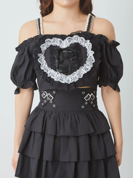 ハート&スピンドルがONされて、ガーリームードが盛り上がるオフショルTOPSの登場です♪ 胸元に、レースのハートが、ほどこされて、好アクセントに映えます。スピンドルのあしらいが、甘いニュアンスをプラス◎ オフショル仕様&着丈が短く、肌感がUPし、旬で女の子らしさがあふれるアイテムです☆