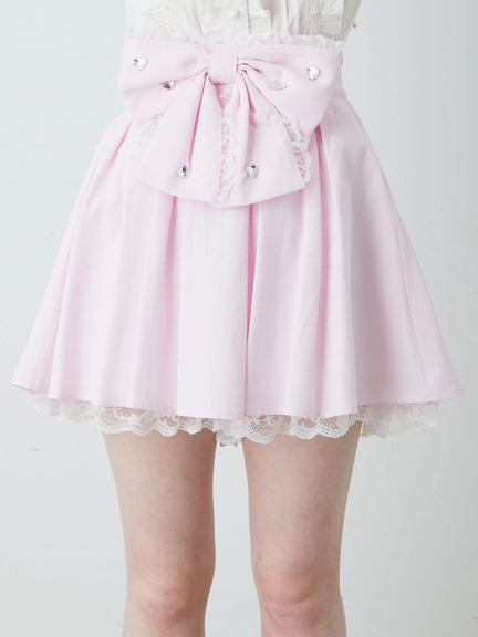 Bigリボンが付いて、ガーリームードが高まるスカパンの登場です♪ ウエストに、大きなリボンモチーフが、デザインされて、好アクセントとして、着映えします。ビジュー&レースのあしらいも、上品な可愛らしさをプラス◎ ふんわりとしたミニ丈のシルエットながら、スカパン仕様で、アクティブな日にも安心です。鮮度バツグンなスタイルを楽しめるアイテムです☆
