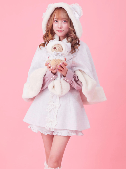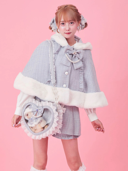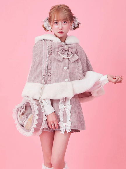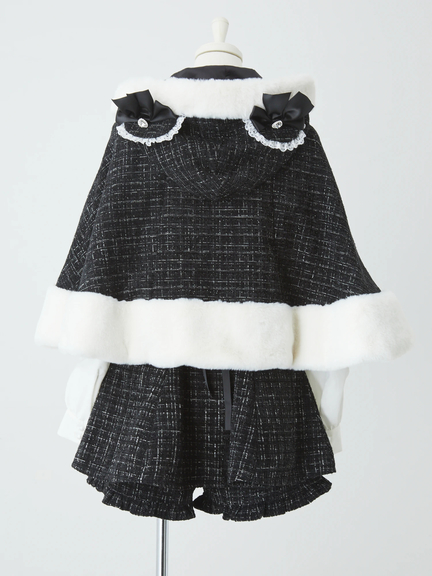 キラキラツイードで、ガーリームードが盛り上がるポンチョのお目見えです♪ フードがデザインされて、可愛らしく、女の子らしさをアピールしてくれます。ツイード素材とファーのコンビネーションが、シーズンらしく、甘いニュアンスをプラス◎ リボン&パールモチーフなど、ディティールも充実し、旬なガーリースタイルを演出してくれるアイテムです☆
