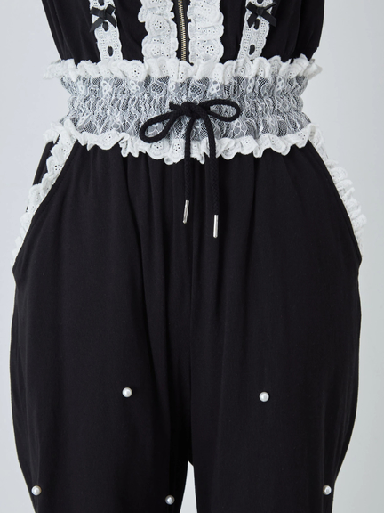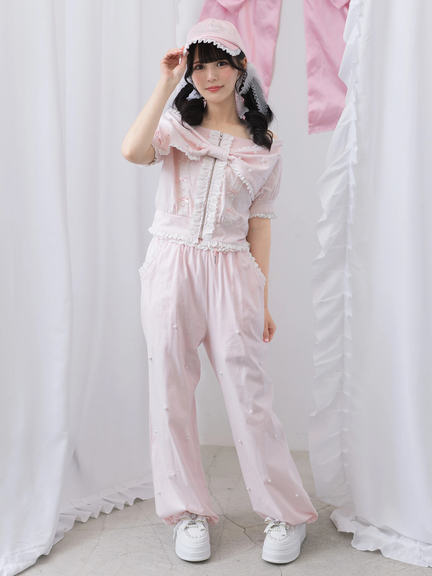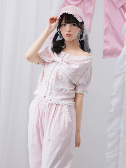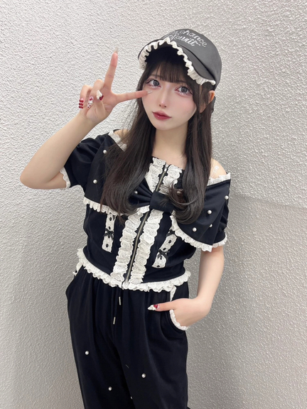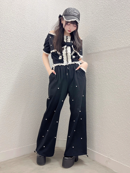 レース&パールがきらめくパンツ♡リボンモチーフが目をひくオフショルトップス【402530132500】を合わせるのがおすすめ♡