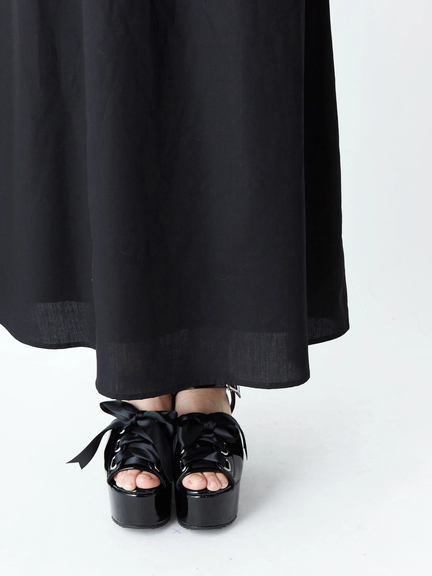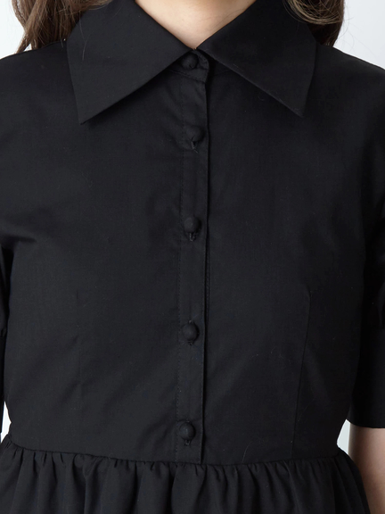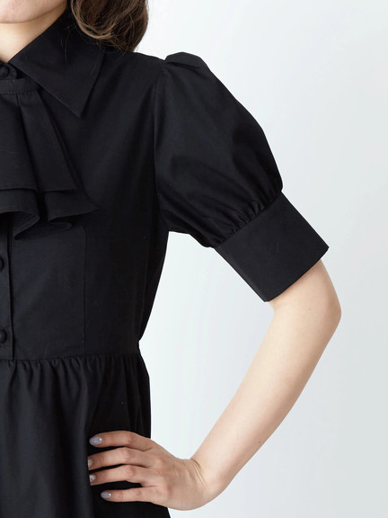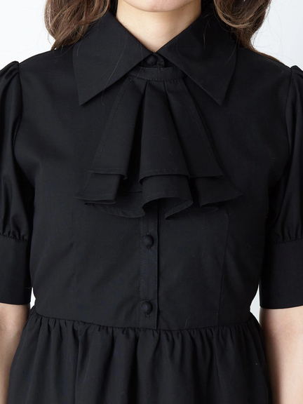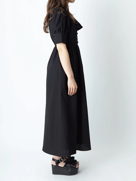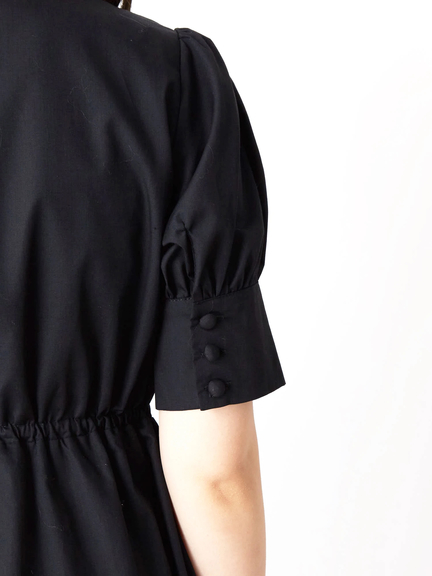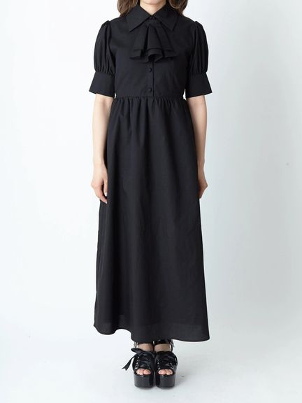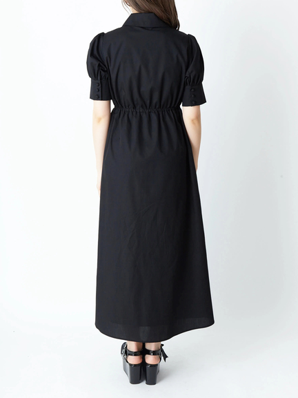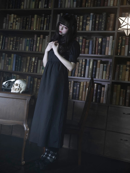 ロング丈が存在感たっぷりの半袖ゴシックワンピースです。コンパクトな上半身に、ウエスト高め切り替えに、オールブラックながらすっきり縦長のシルエットが春夏らしく軽やかで◎ ボタン付きのパフスリーブがクラシカルな上品さを後押しします。胸元のフリルは取り外し可能。シンプルなリトルブラックドレスとしても着こなせる逸品です。