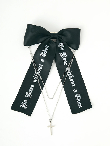 二重に重なったチェーンに、クロスチャームがついて、ゴッシクな魅力を添えるバレッタのお目見えです♪ 英字ロゴをあしらった大きめなリボンが可愛く映え、スタイリングのアクセント役にぴったり◎ クリップ仕様で、ONしやすいのも魅力です。セットでも、シングルユースでも楽しめます☆