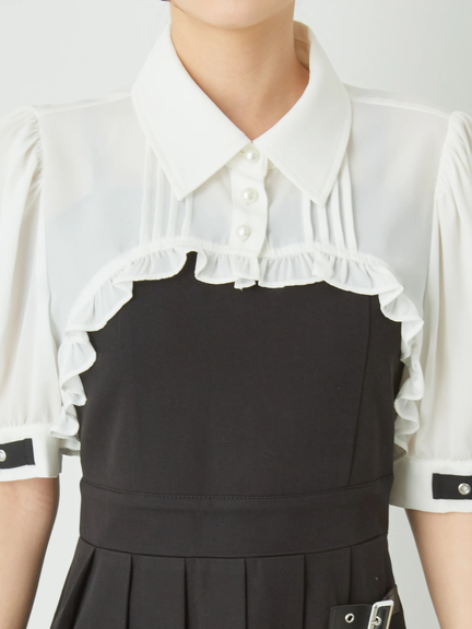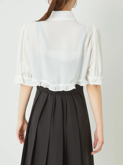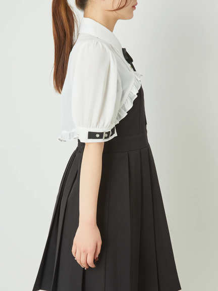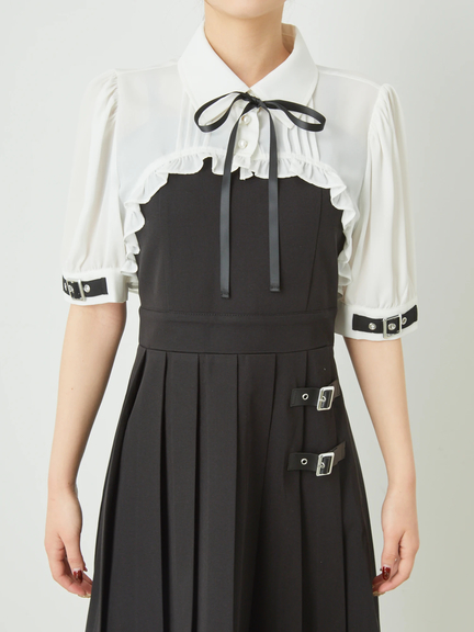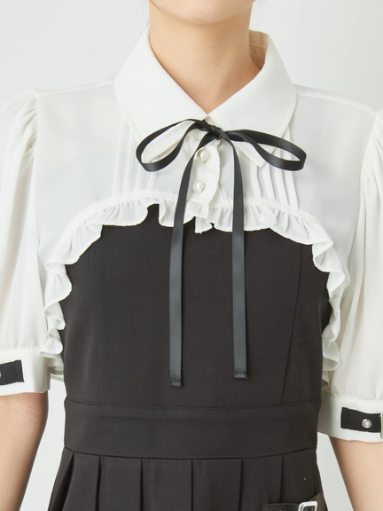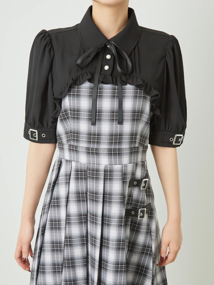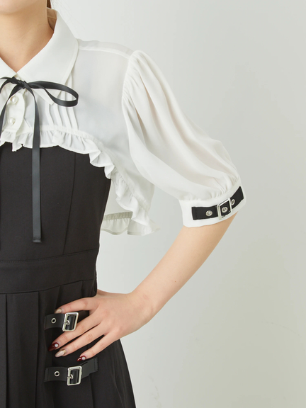 バックルデザインが付いて、ゴシック&ガーリーな雰囲気を醸し出すショートブラウスが登場です♪ 5分丈のスリーブには、バックルがあしらわれて、スパイシーさをONし、着こなしをアップデートしてくれます。首元には、リボンに、タック入りで、上品さをプラス◎ ショート丈で、裾にはフリルがほどこされて、女の子らしさが際立つ逸品です☆