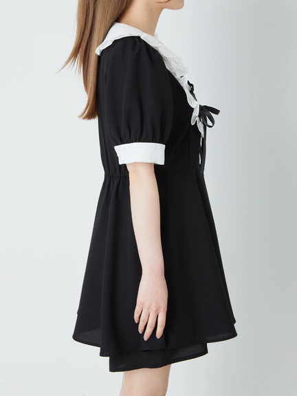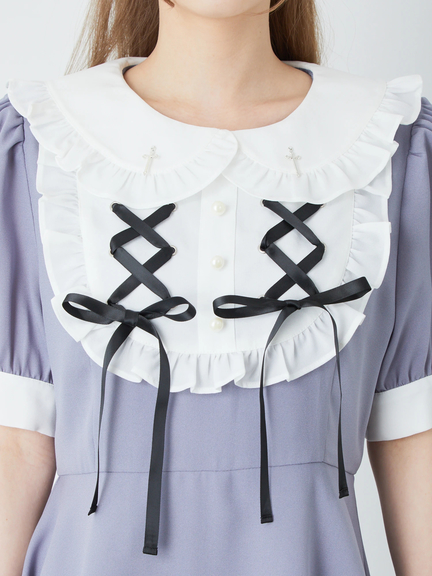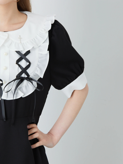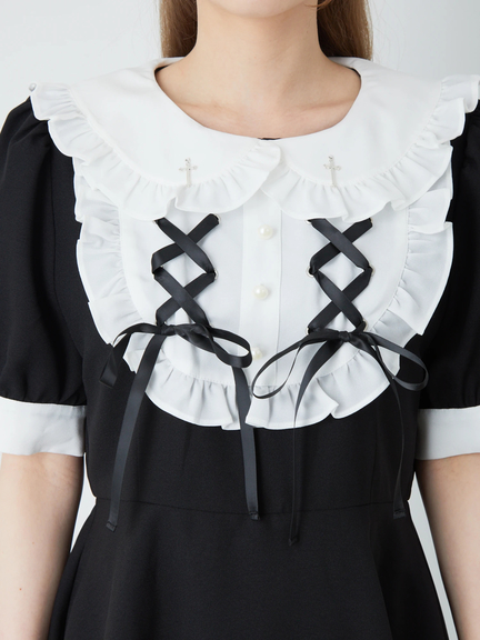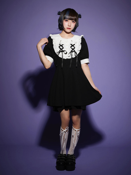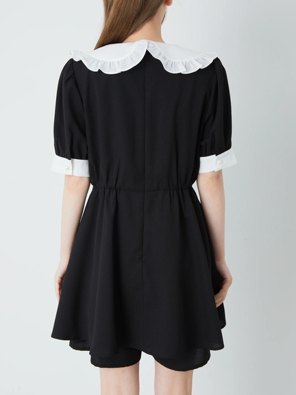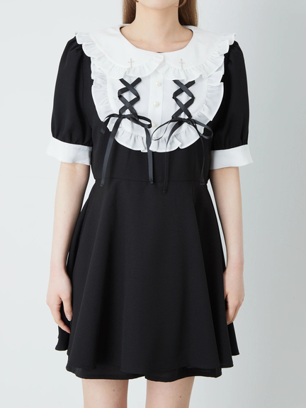 スピンドルリボンをONしたヨーク切り替えで、お顔まわりがキュートにキマるコンビネゾンの登場です♪ 真っ白な衿&ヨーク切り替えに、フリルやパールボタンがついて、愛らしさバツグンのルックスをメイク◎ ウエストをシェイプし、ふんわりと広がるラインで、女の子らしいシルエットを叶えてくれます。旬な配色デザインで、鮮度感もUPする逸品です☆