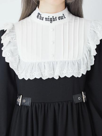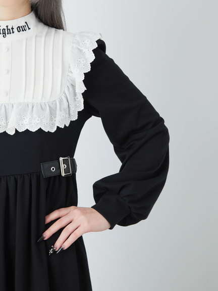 ロング丈で、ゴシックな雰囲気が高まるワンピースのお目見えです♪ 大きなヨークに、ゴシックなロゴ入りのカラーが、甘辛ムードを演出し、スタイリングをアップデートしてくれます。ハイウエストで、腰の位置が高い設計になり、ベルトのあしらいも、好アクセントになり◎ ロングシルエットで、全体のスタイルもよく見える一着です☆