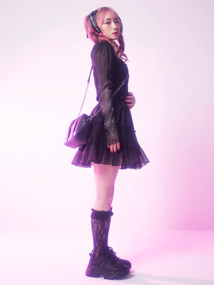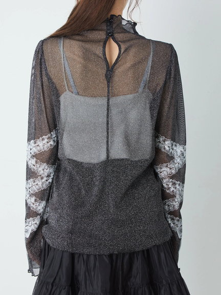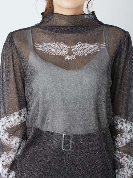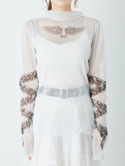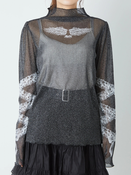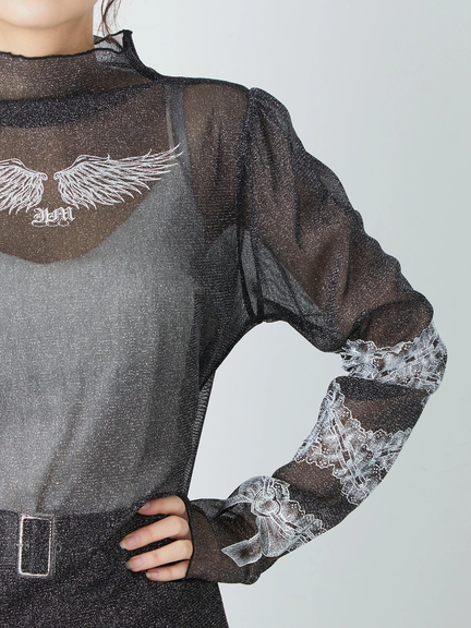 旬なシアー素材で、レイヤードスタイルが可愛くキマるトップスの登場です♪ フロントのエンジェルプリントと、スリーブのリボンが、ゴシックな魅力をON◎ ラメを散りばめたデザインは、華やかさがあって、クラスアップな雰囲気をプラスします。ほどよくゆとりのあるシルエットで、ボトムスにINもOUTもスタイル良くキマる一枚です☆