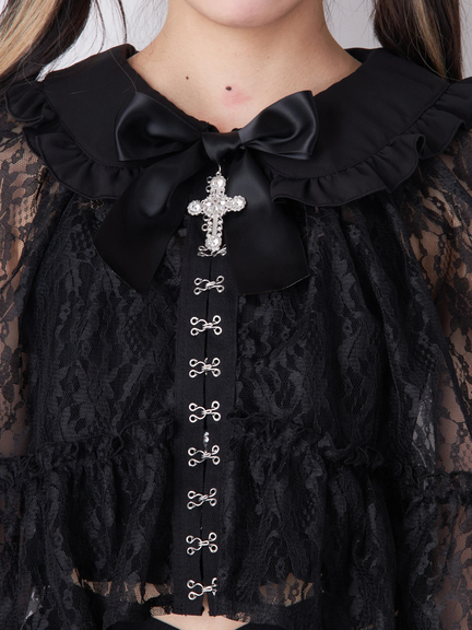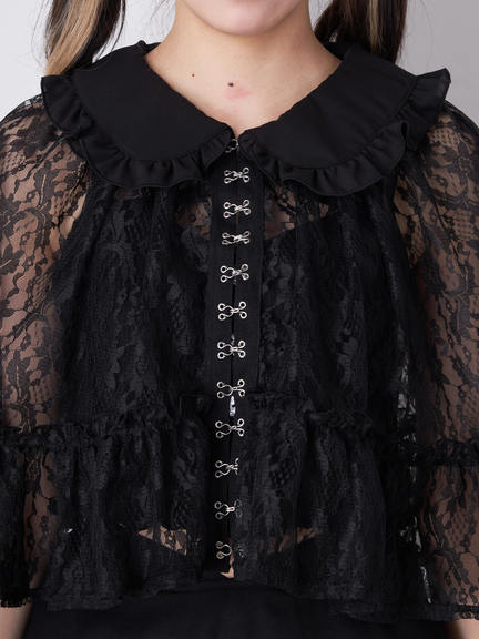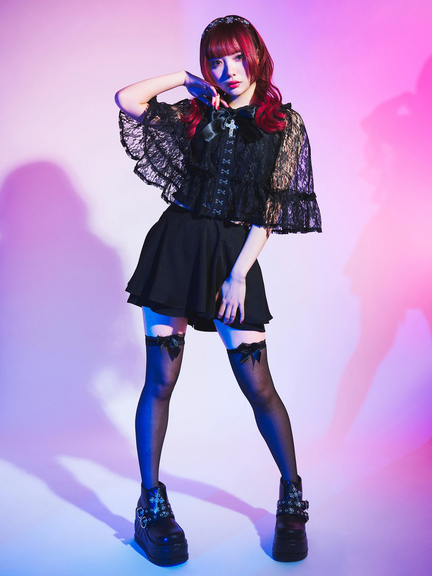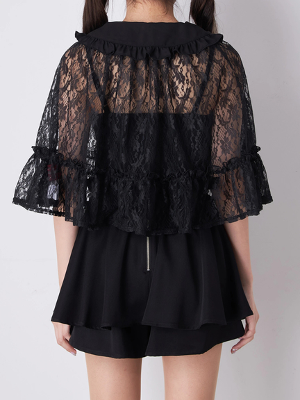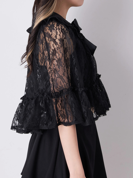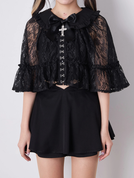 クロス&リボンが付属し、ゴシック&ガーリーな雰囲気が楽しめるフリルケープの登場です♪ 首元には、クロスとリボンが、ほどこされて、甘辛なテイストをONして、着こなしをアップデートしてくれます。レースの透け感が、アームラインの華奢見えを叶え、上品さをプラス◎ フリル使い&ケープデザインが、クラス感を演出してくれる一着です☆