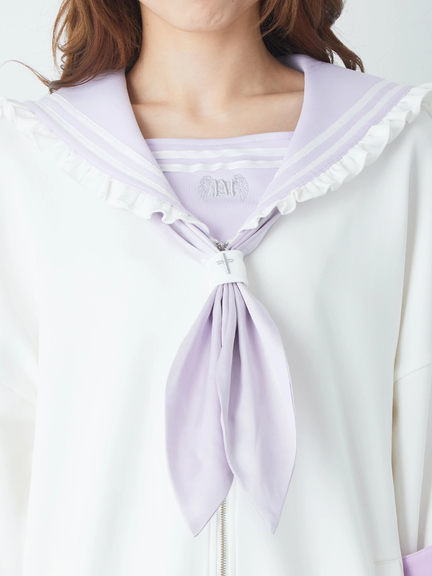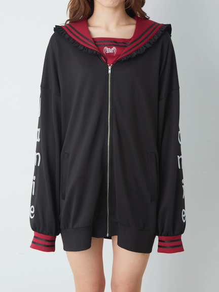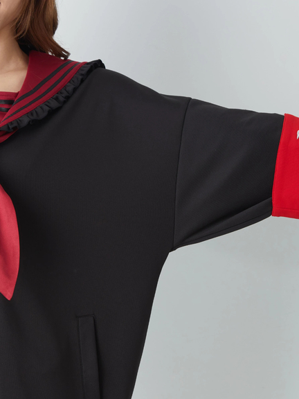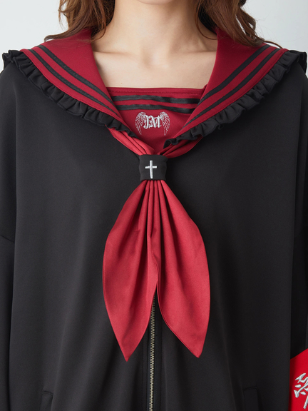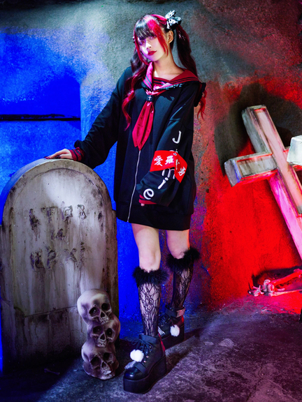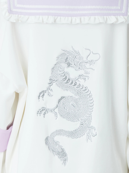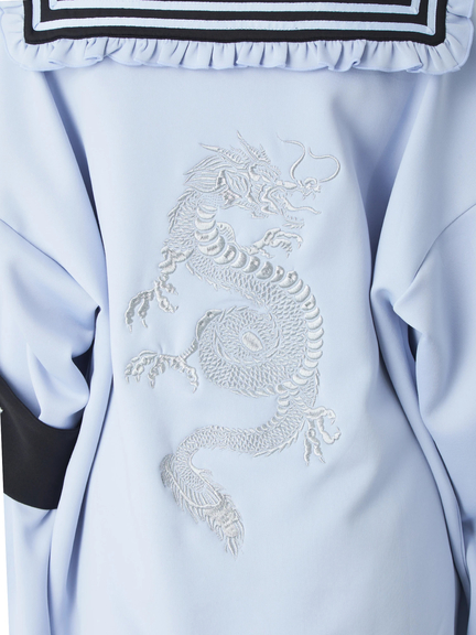 特攻服風デザインで、ゴシックな雰囲気を醸し出すセーラーパーカーの登場です♪ 大きな襟のセーラー風なあしらいに、背中のドラゴン模様が、甘辛なテイストを放ちます。スリーブには、ブランドロゴが、ほどこされて、エッジさをプラス◎ 着丈が長く、ゆったりとして、一枚風に着こなせば、女の子らしさも演出できます☆