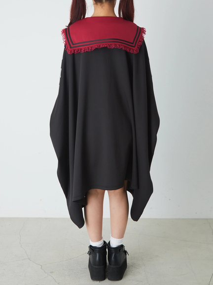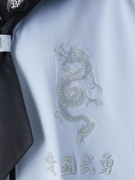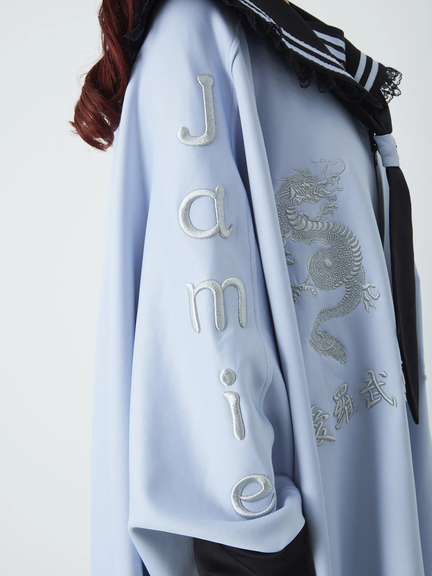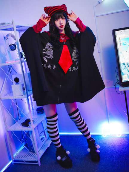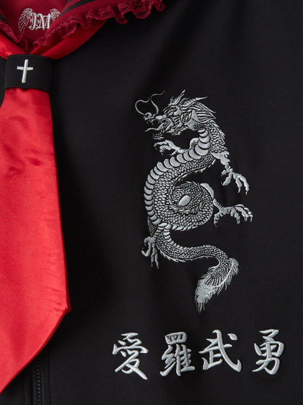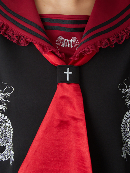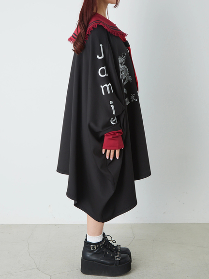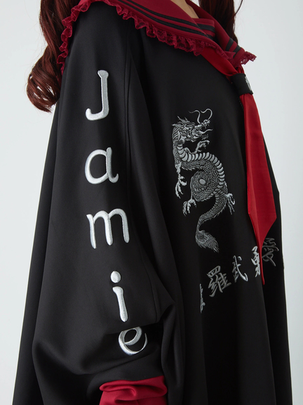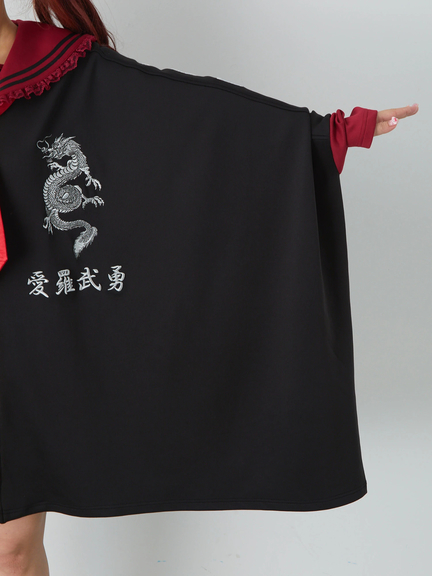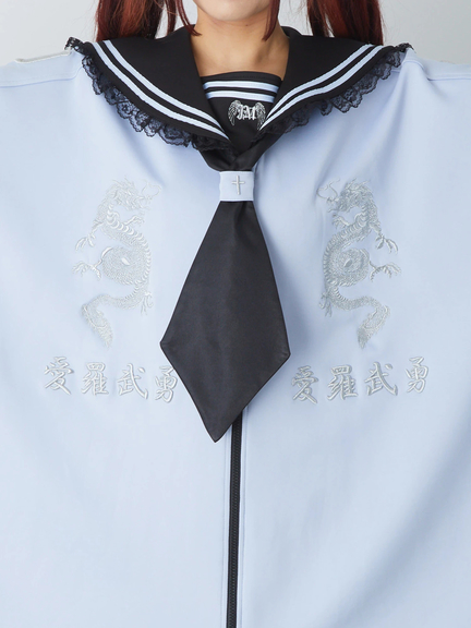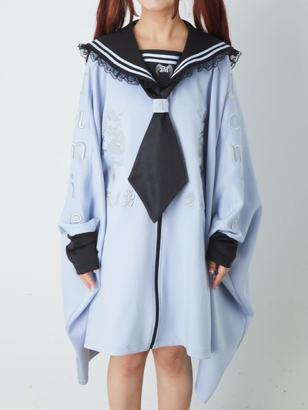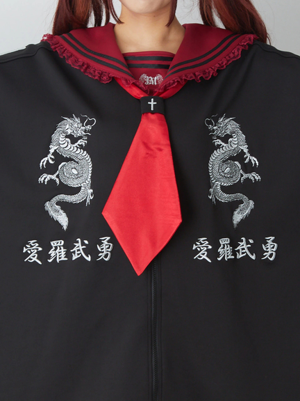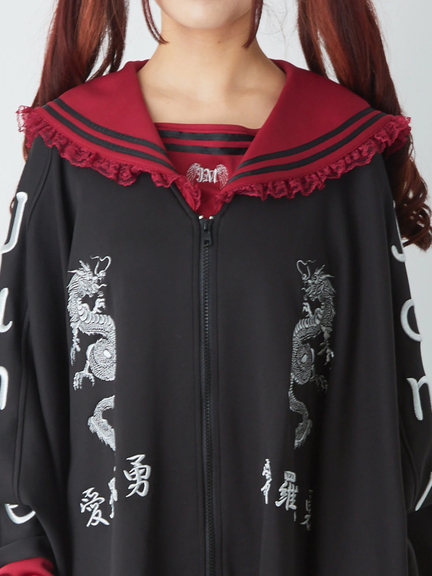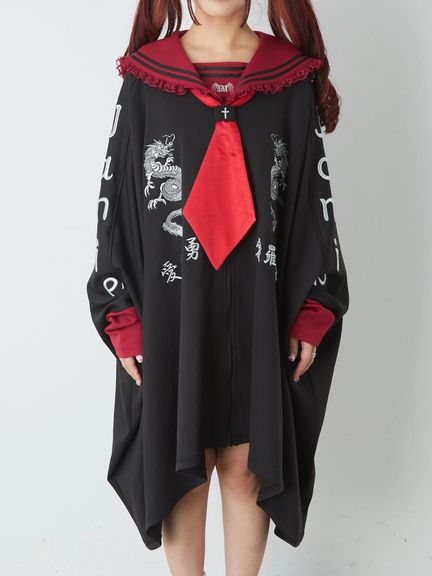 四角デザインで、ゴシック&ガーリーな雰囲気を楽しめるセーラーパーカーの登場です♪ 四角にデザインされたシルエットが、存在感があり、スタイリングをアップデートしてくれます。胸元には、ドラゴンの模様やロゴが入り、スパイシーさをプラス◎ セーラーに、ネクタイが付属して、甘辛ムードが堪能できる一着です★