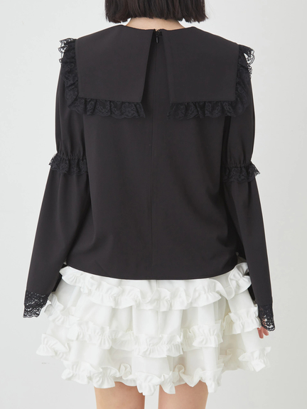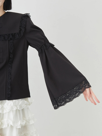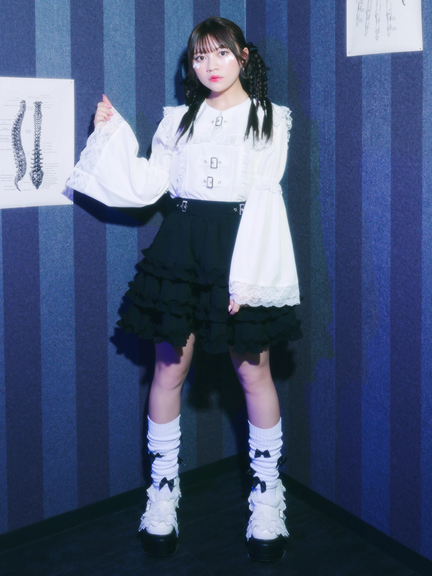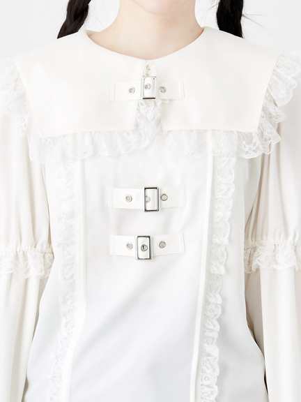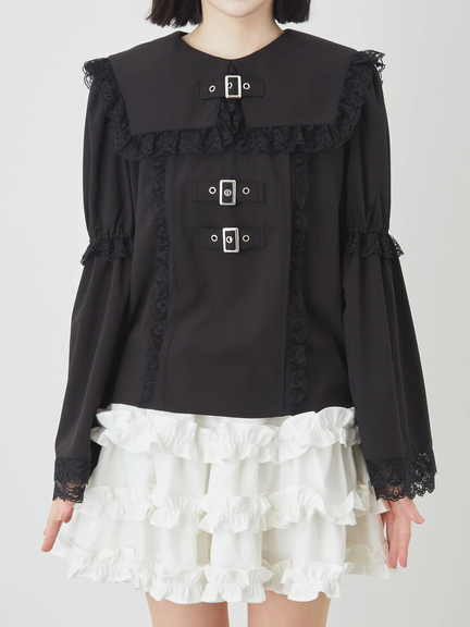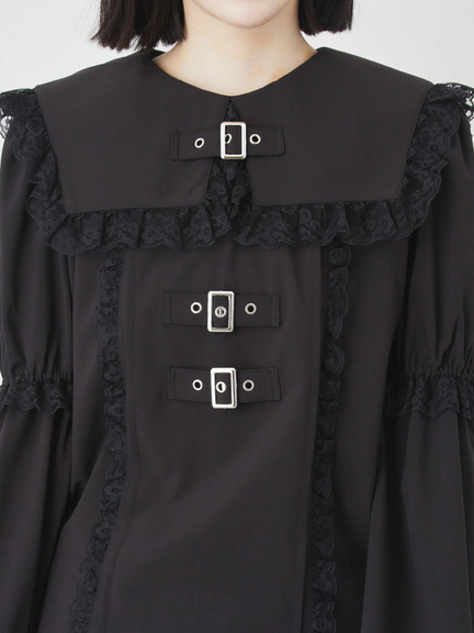 姫袖デザインで、ゴシック可愛い雰囲気をまとえるセーラーブラウスの登場です♪ 広がりのある姫袖が、ほどこされて、可愛らしく、スタイリングをアップデートしてくれます。フロントには、ベルトが並んで、辛口なテイストをプラス◎ セーラーカラーやレースフリルなど、上品さも加えて、甘辛バランスな女の子スタイルを、楽しめる逸品です★