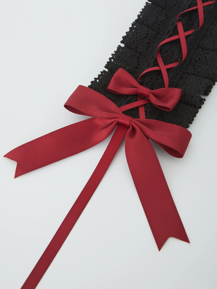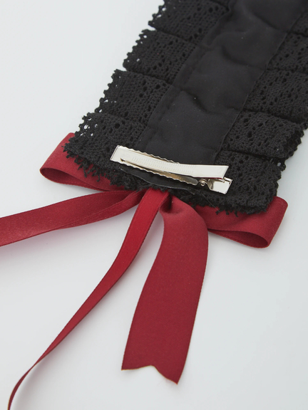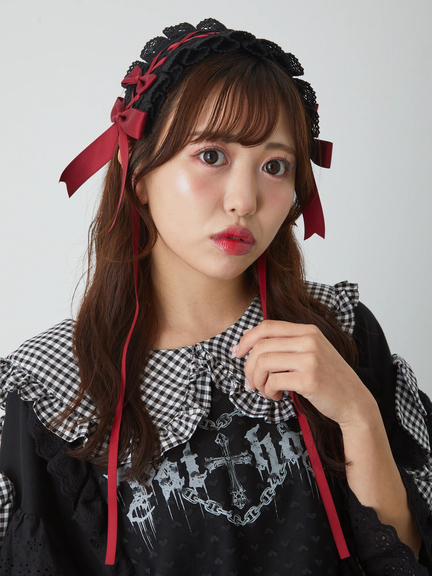 リボン&スピンドルで、ゴシックムードが高まるヘッドドレスの登場です♪ リボンとスピンドルが、ほどこされて、甘辛テイストになり、お顔まわりを、華やかに魅せてくれます。レースとの組み合わせで、ボリュームがあり、存在感も◎ ヒモを首元で結べるなど、アレンジができて、旬な女の子スタイルを楽しめる逸品です☆