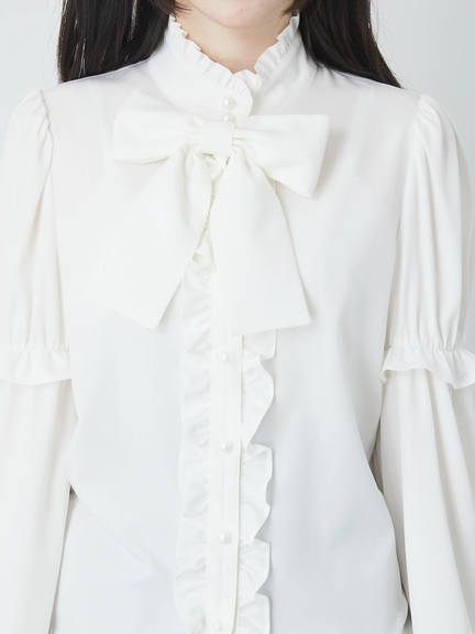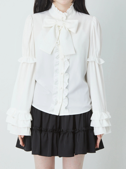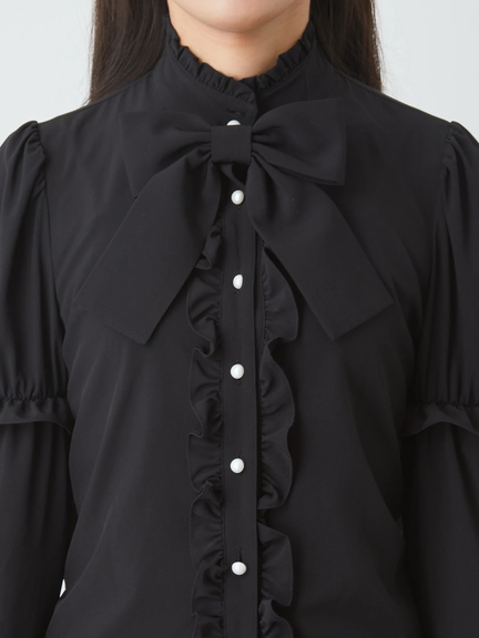 姫袖で、ゴシック&ガーリーなムードが高まるブラウスの登場です♪ 姫袖のデザインが、あしらわれて、存在感&可愛さがUPし、スタイリングの好アクセントになります。首元には、大きなリボンが、ほどこされて、お顔まわりを、華やかな印象に◎ フリルをふんだんに使い、甘いニュアンスを加速させて、鮮度高めの甘辛テイストスタイルを楽しめる一着です☆